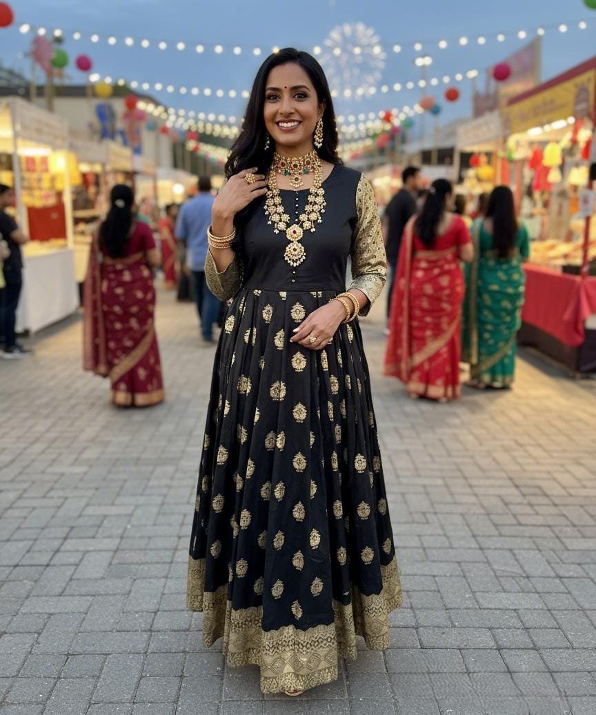 Gold Brocade Work: The skirt is adorned with all-over Gold Zari Butti (motifs), creating a beautiful contrast against the vibrant Deep Black base.