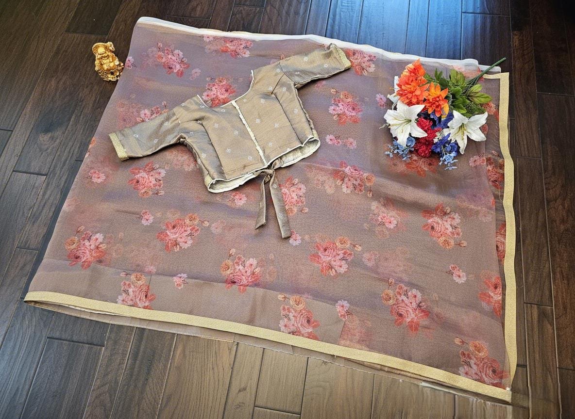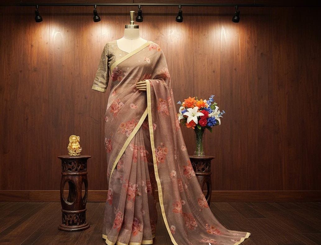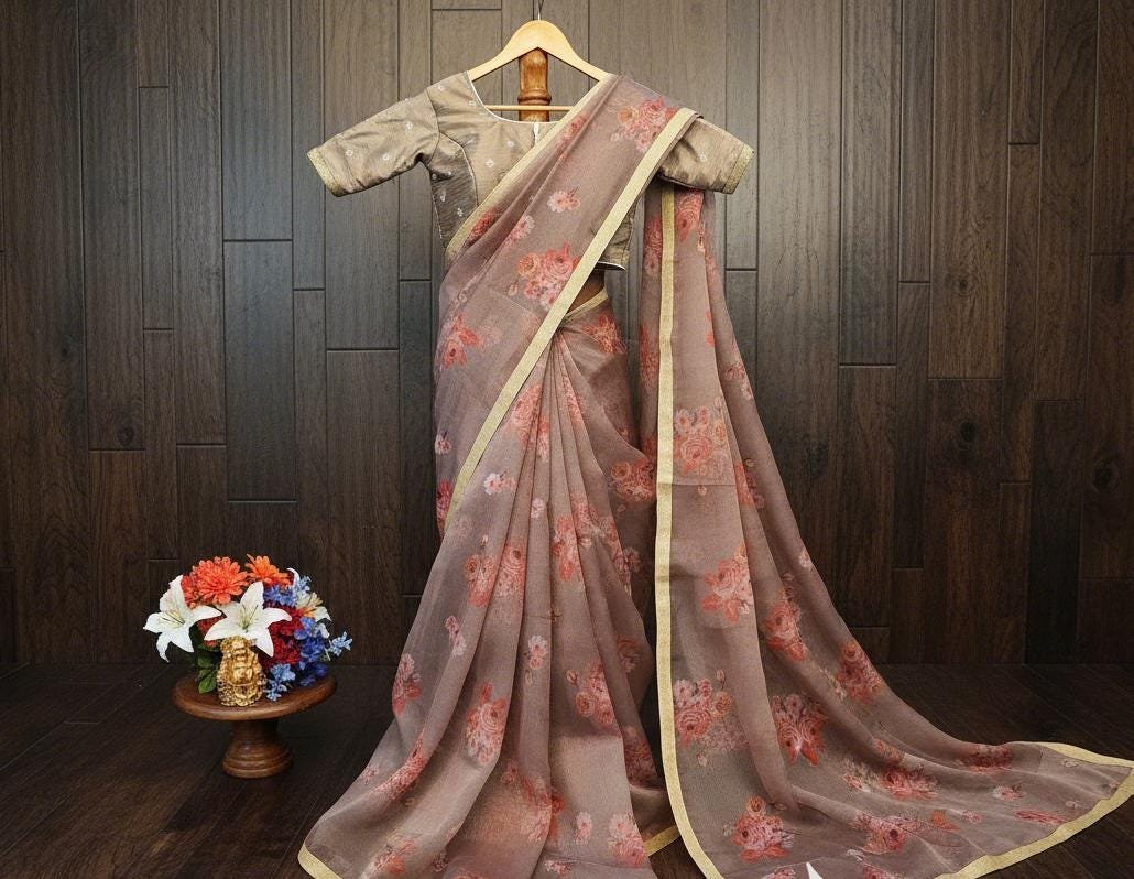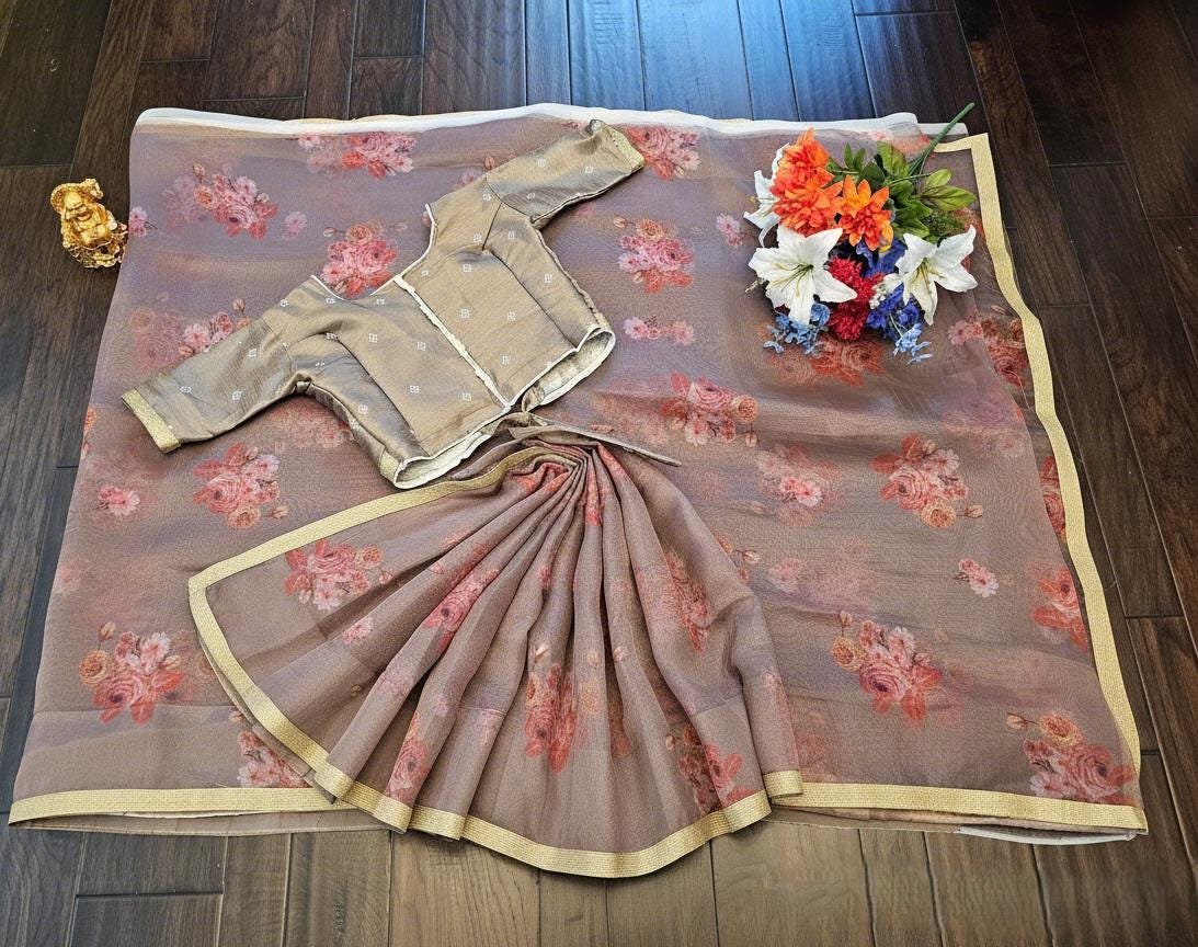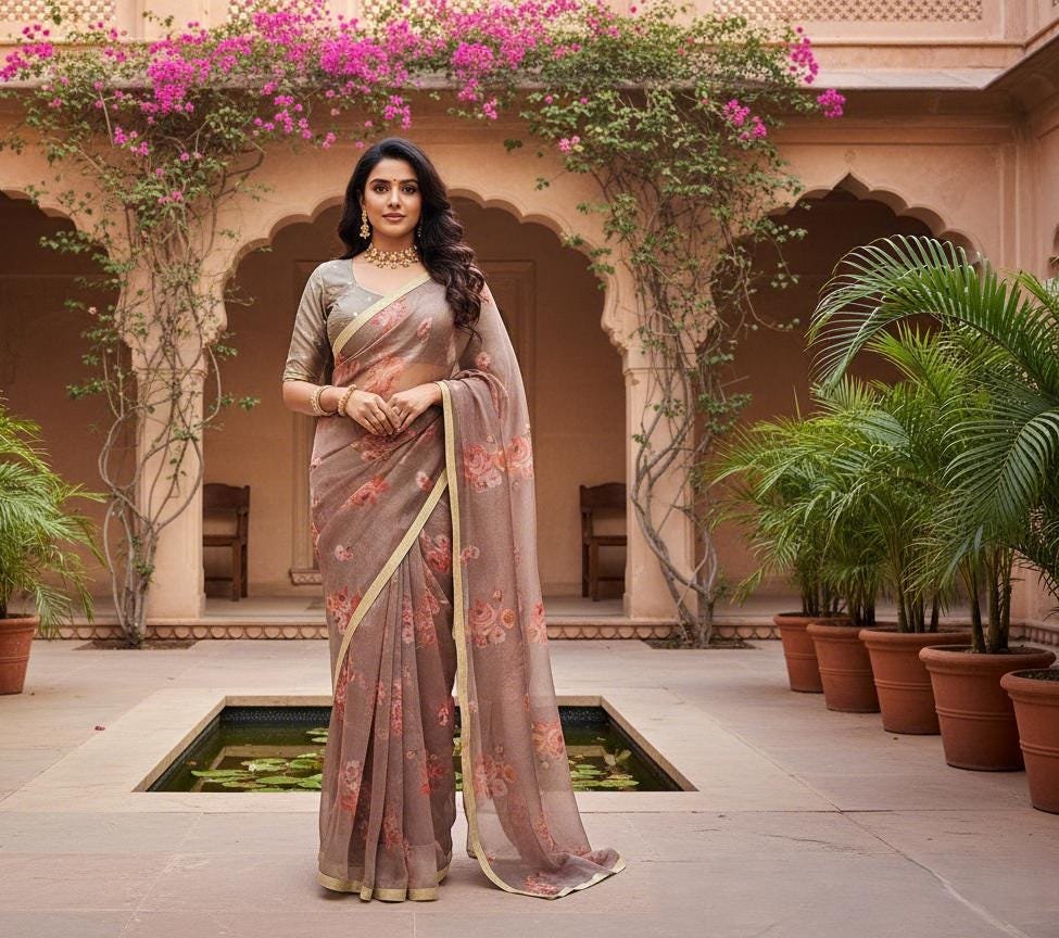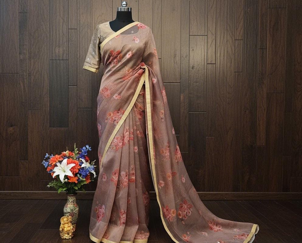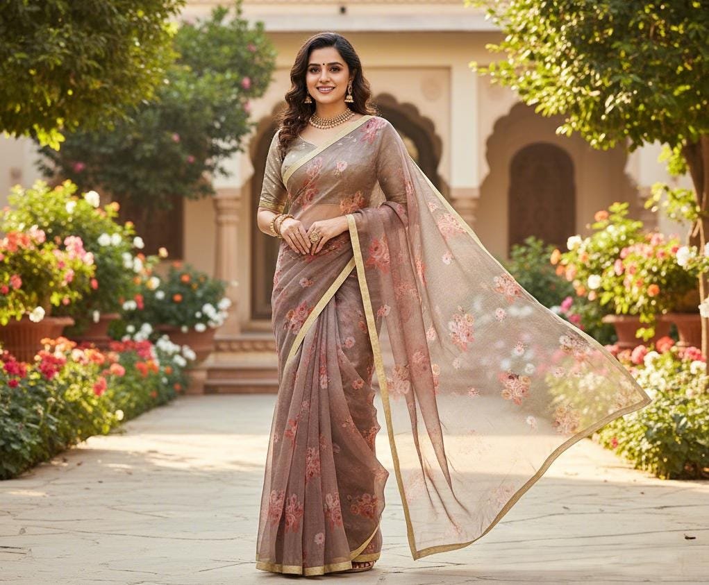 Add timeless elegance to your wardrobe with this stunning brown floral organza saree. Featuring delicate rose prints in soft red and pink tones, this saree perfectly blends sophistication with feminine charm. The golden edge border adds a subtle shimmer, making it ideal for festive occasions, weddings, and celebrations.