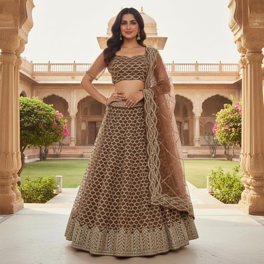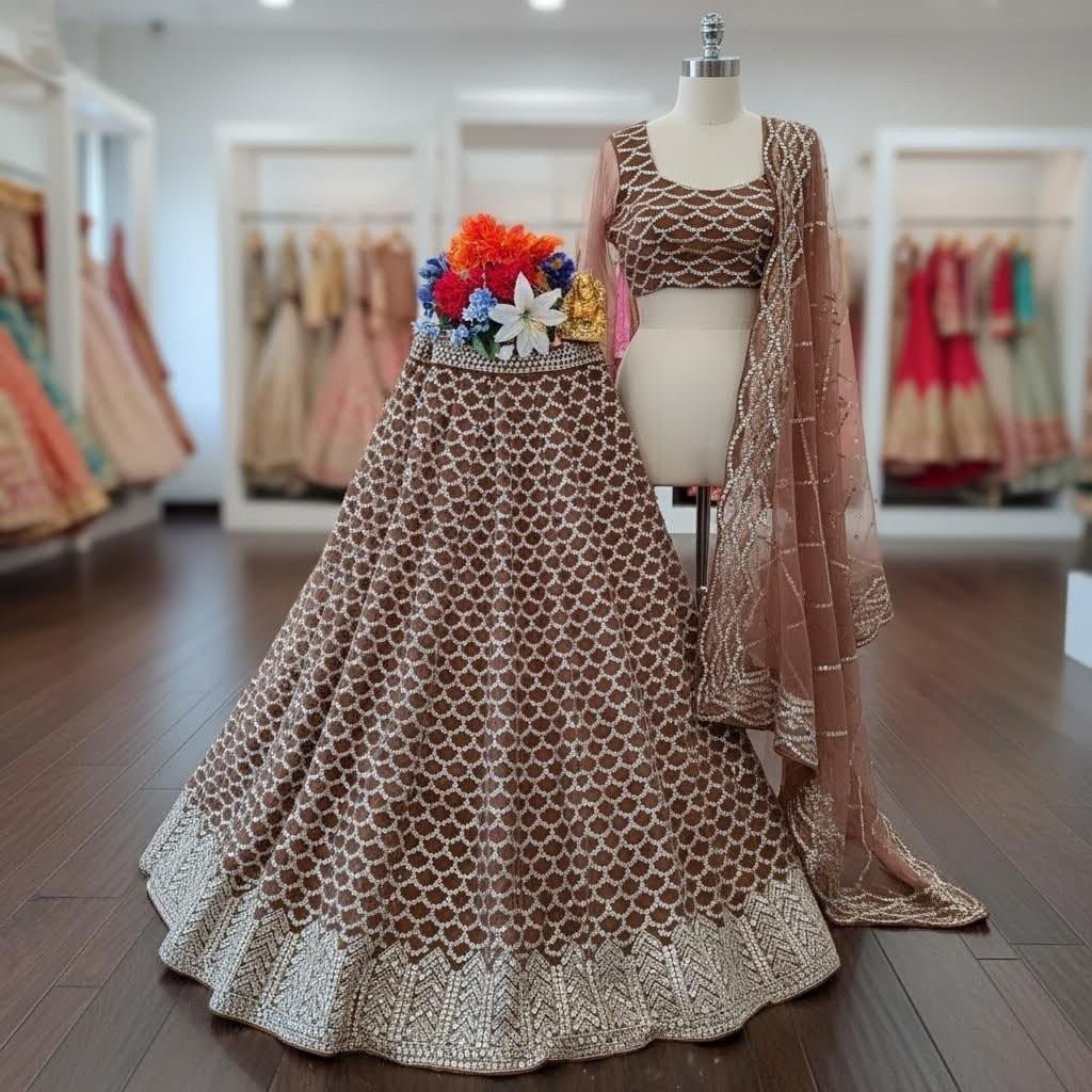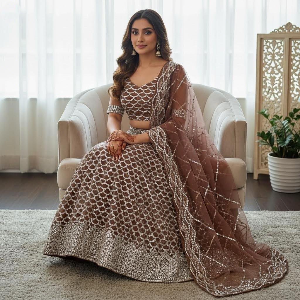 Elevate your ethnic wardrobe with this stunning Chocolate Brown Lehenga Choli Set, beautifully adorned with intricate mirror and sequin work.