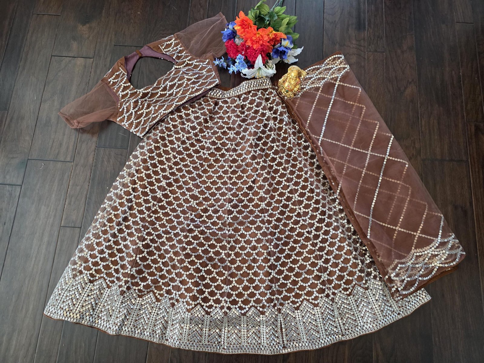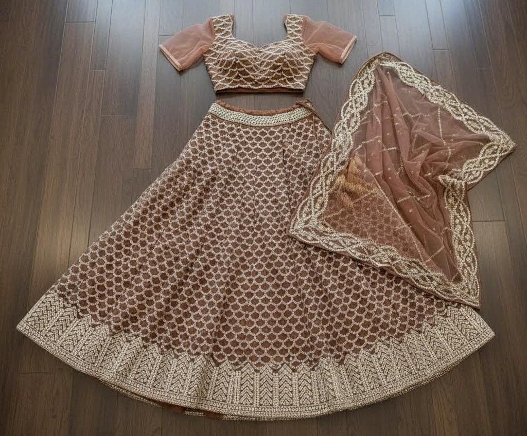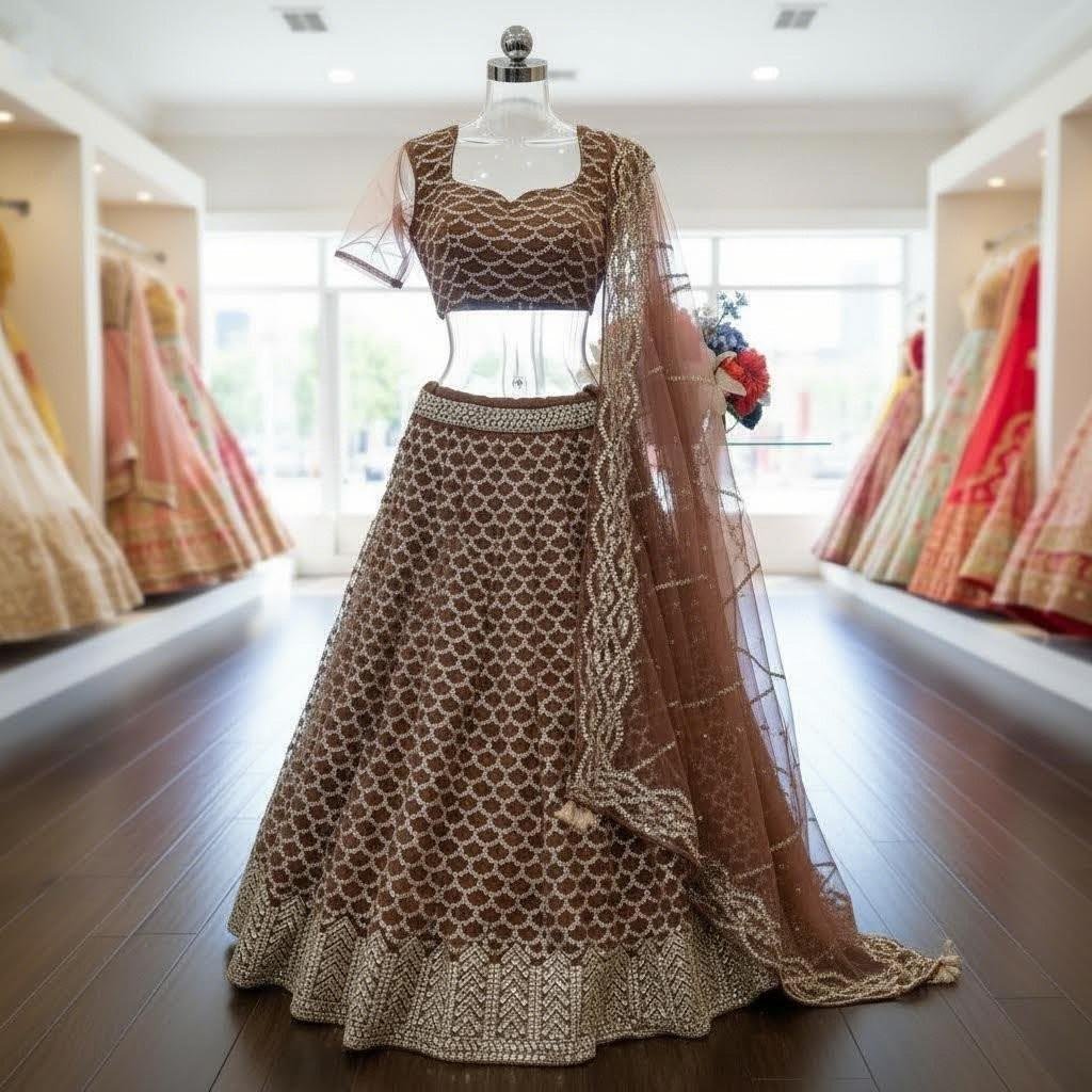 Elevate your ethnic wardrobe with this stunning Chocolate Brown Lehenga Choli Set, beautifully adorned with intricate mirror and sequin work.