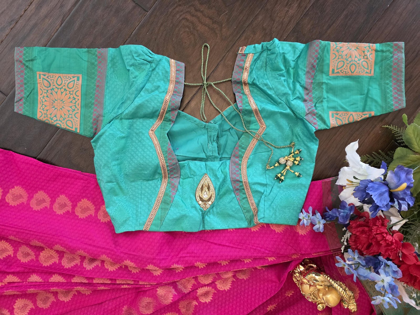 BLOUSE : BEAUTIFUL STITCHED DESIGNER BORDER BLOUSE WITH DANGLINGS.