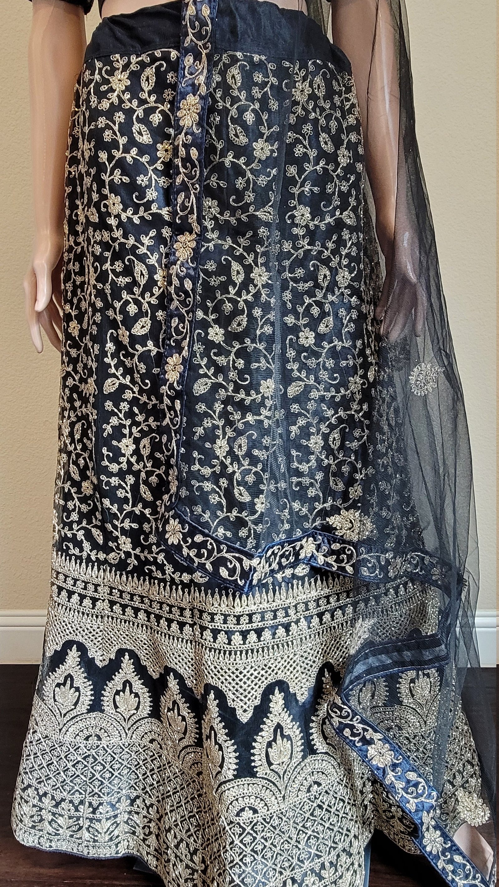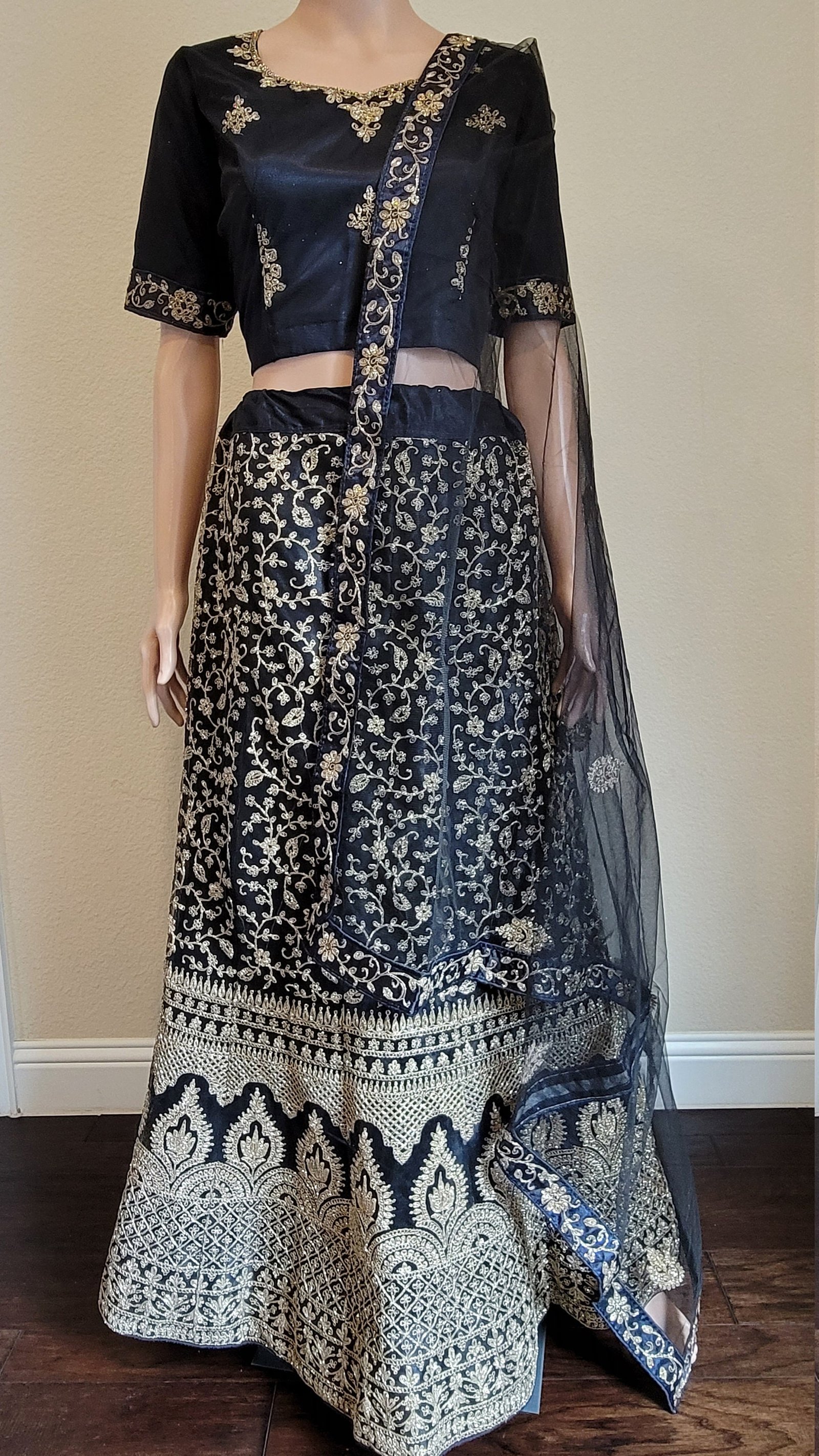 The circular lehenga is made from a glitter net fabric, intricately embroidered to perfection and fully stitched for your convenience. It is lined with a soft Santoon silk inner layer for comfort, and includes a cancan to add that extra volume and flair to your twirls. The lehenga comes in a radiant black color, which is sure to turn heads wherever you go. The waist size is 38 inches and the height is 43 inches, designed to flatter any body type.