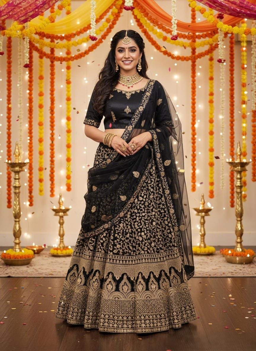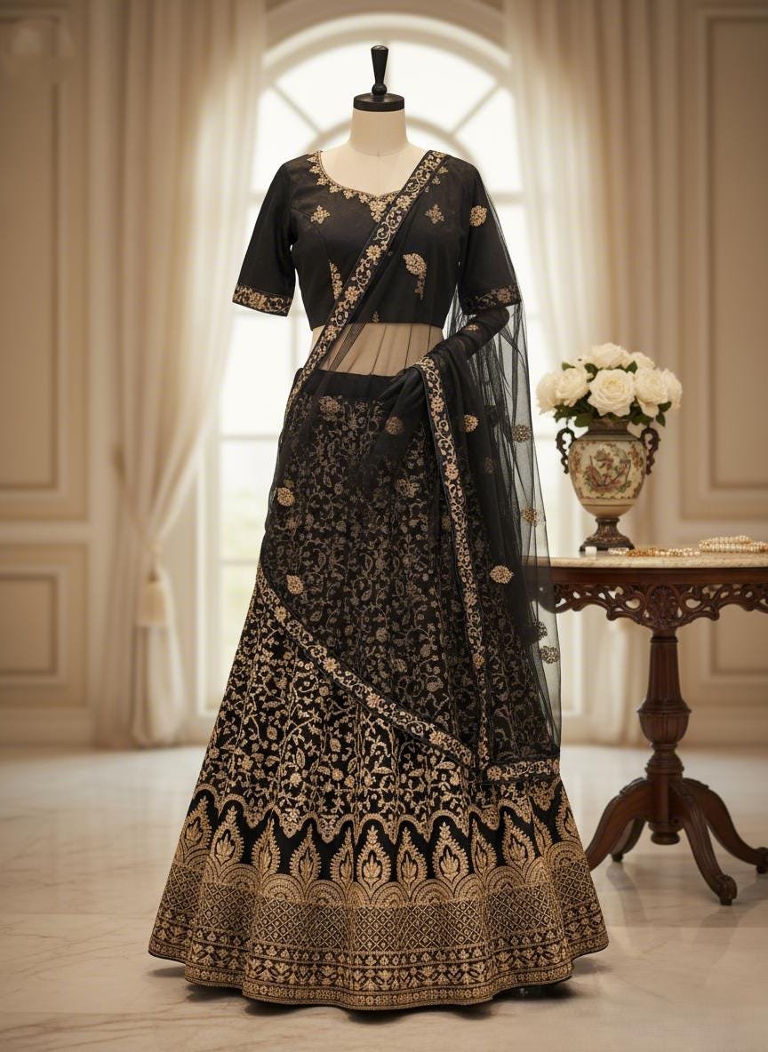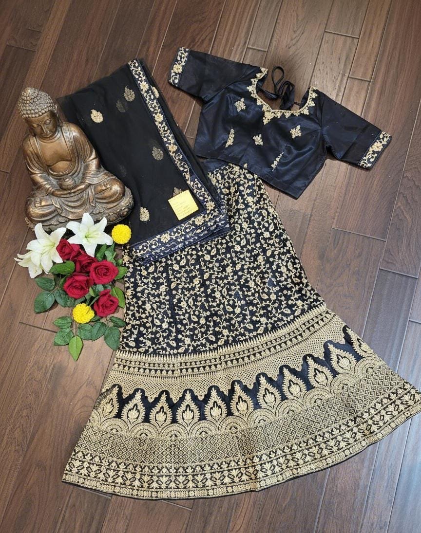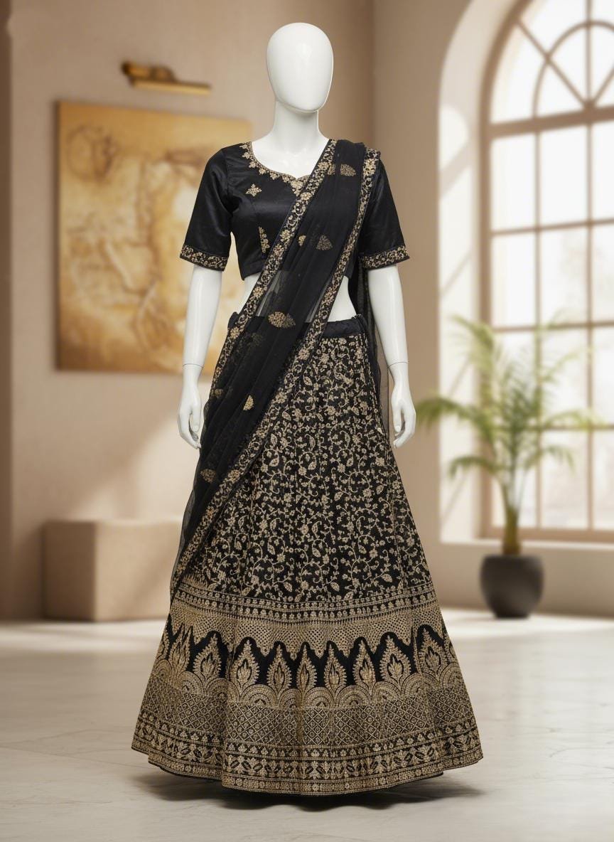 The blouse/choli is crafted from luxurious Malay satin, and is embroidered with a Dori design to complement the lehenga. It is fully stitched and comes in a free size, with a chest measurement of 38 inches and a 2-inch margin on both sides for adjustments. To complete the look, the ensemble comes with a soft net fabric dupatta, elegantly embroidered on all four sides, in a matching black color and a generous length of 2.5 meters.