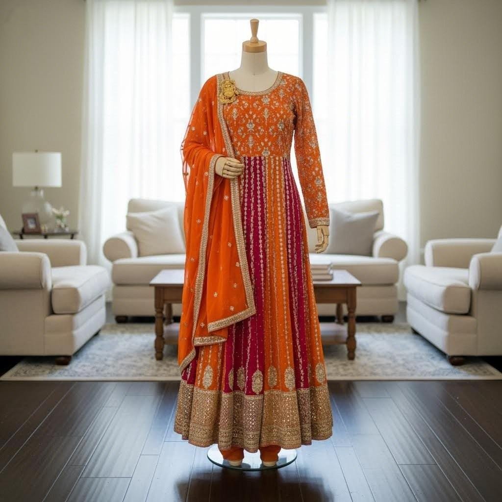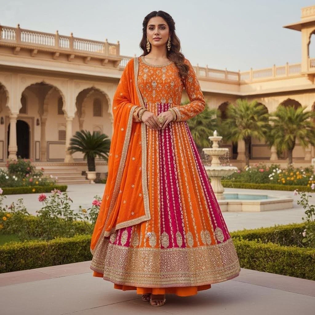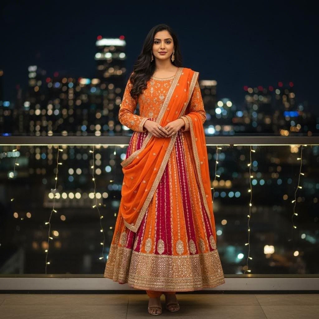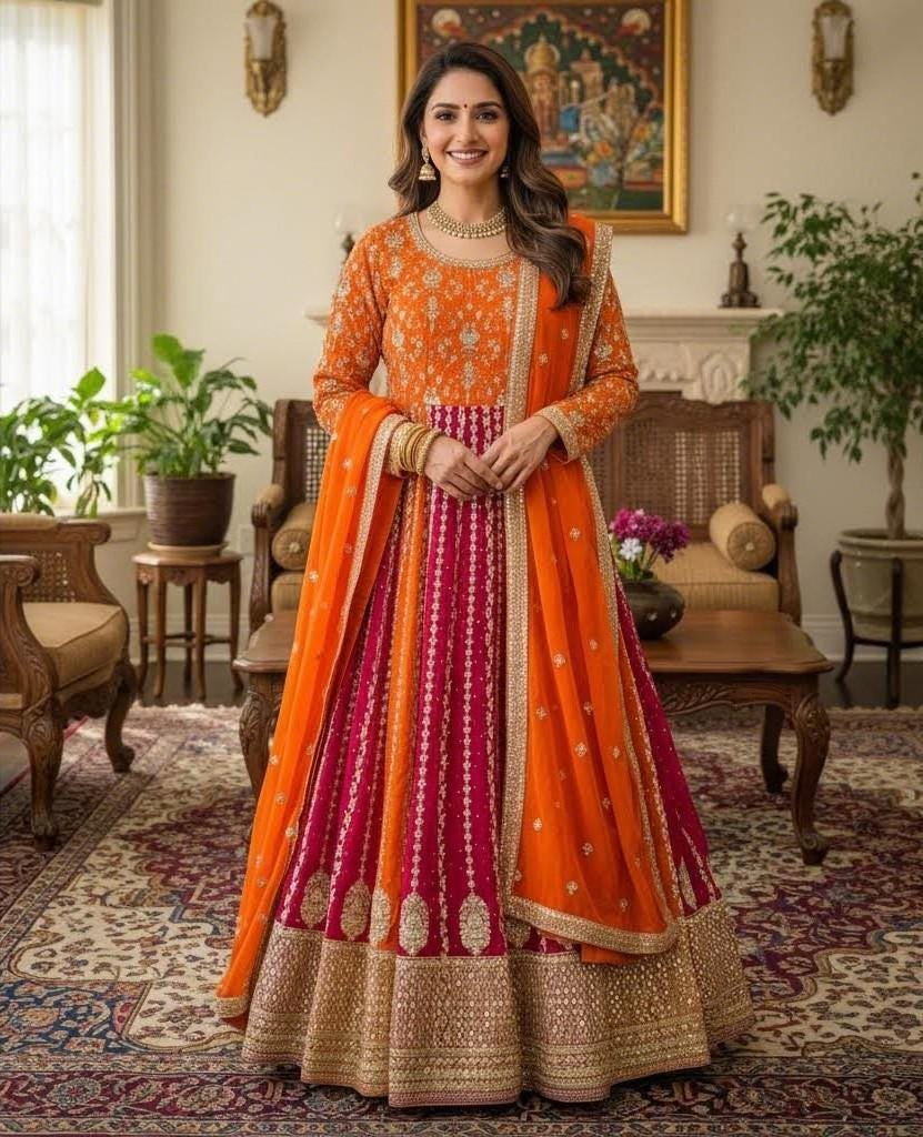 This stunning Orange & Magenta Anarkali Suit is a showstopper, crafted with rich embroidery and traditional detailing. The long flared silhouette, full sleeves, and beautifully embellished dupatta make it the perfect festive and party wear outfit.