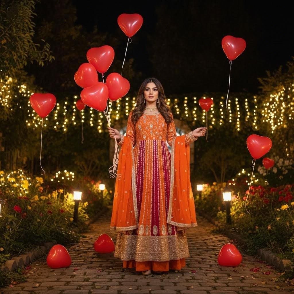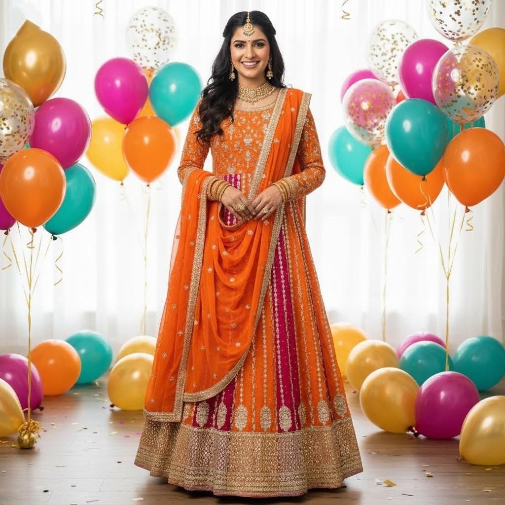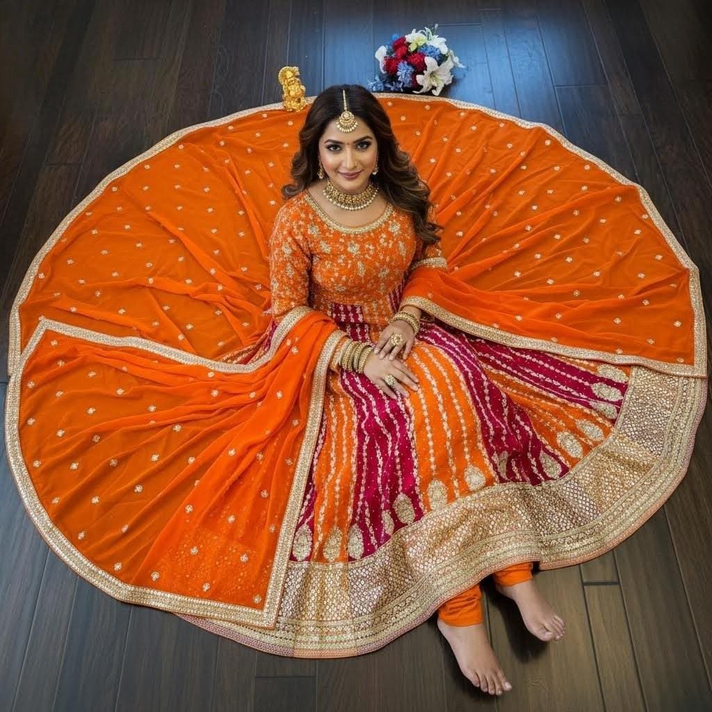 This stunning Orange & Magenta Anarkali Suit is a showstopper, crafted with rich embroidery and traditional detailing. The long flared silhouette, full sleeves, and beautifully embellished dupatta make it the perfect festive and party wear outfit.