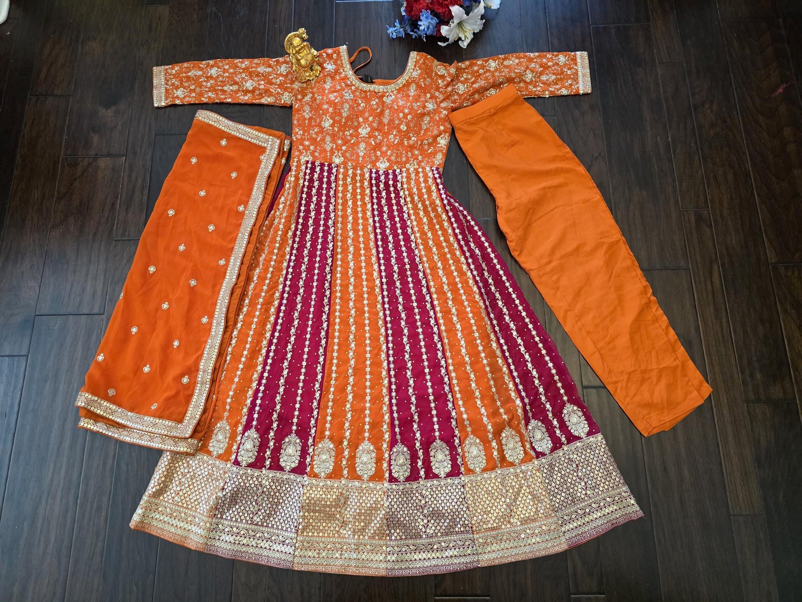Long embroidered Anarkali gown (Orange + Magenta panelled design)