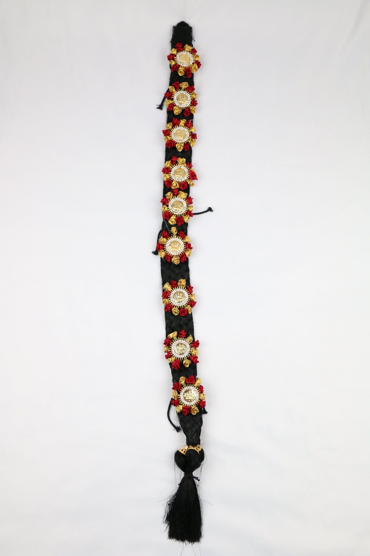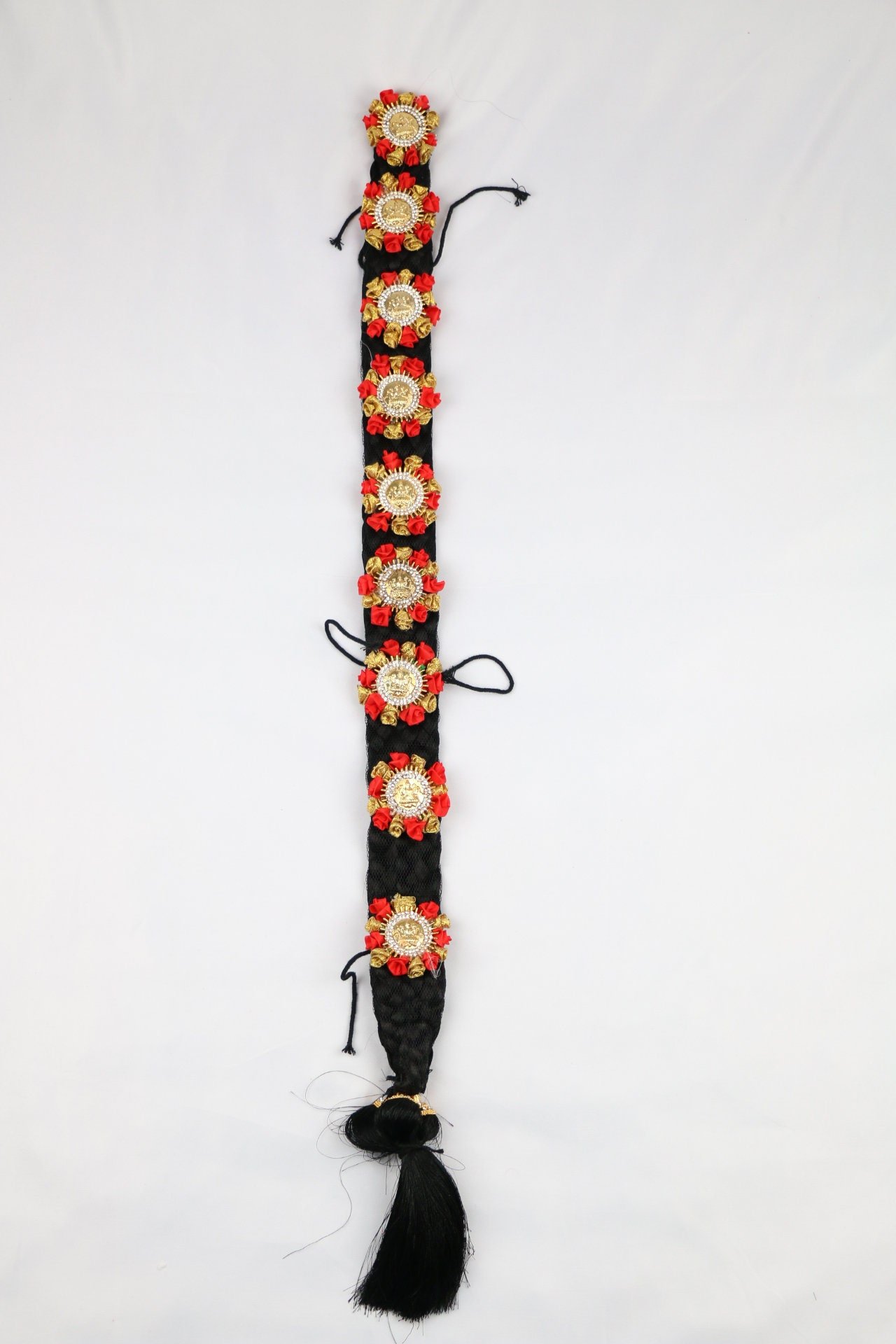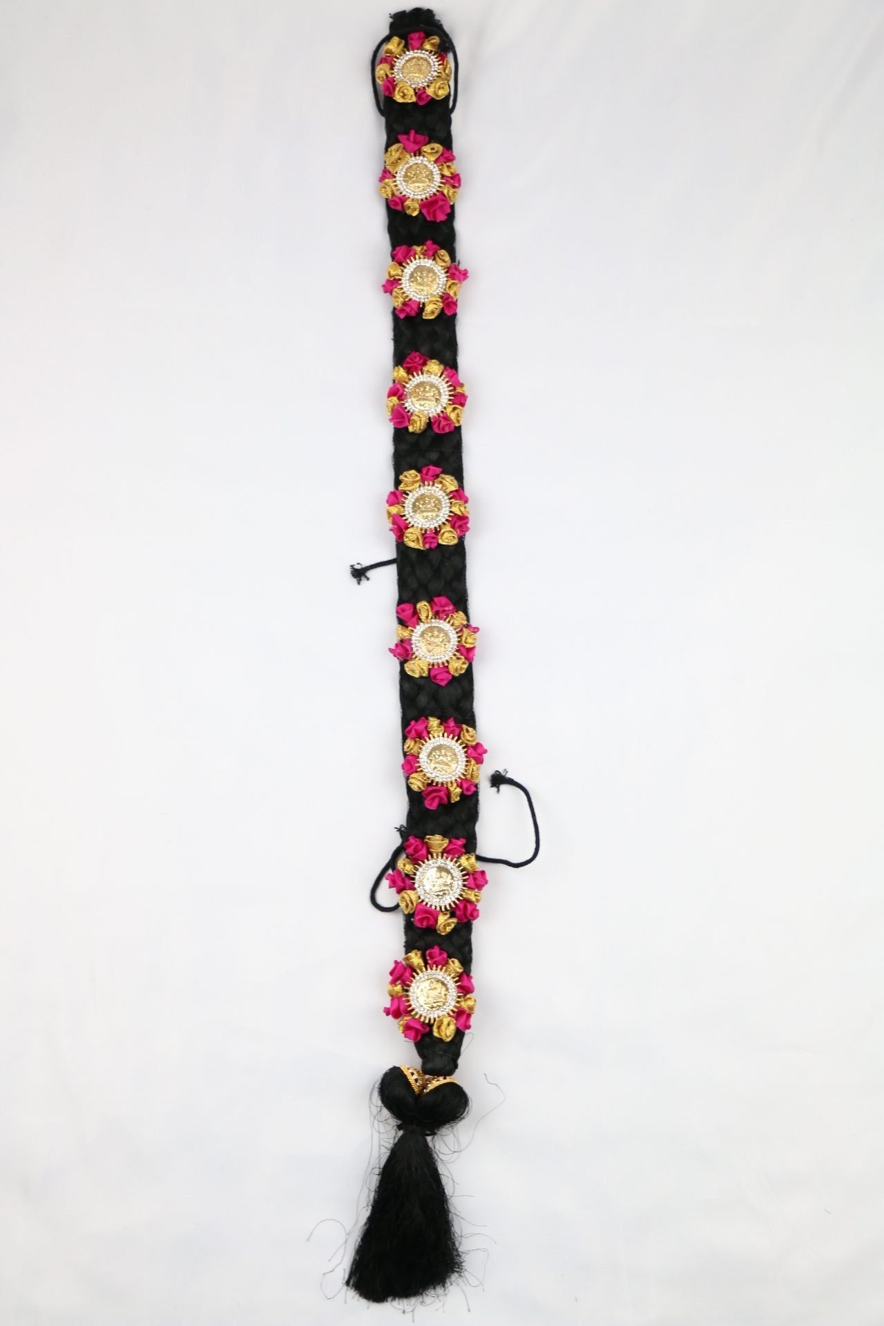 False hair with Stone/round shaped jada billas and kunjalam at the bottom for hair decoration.