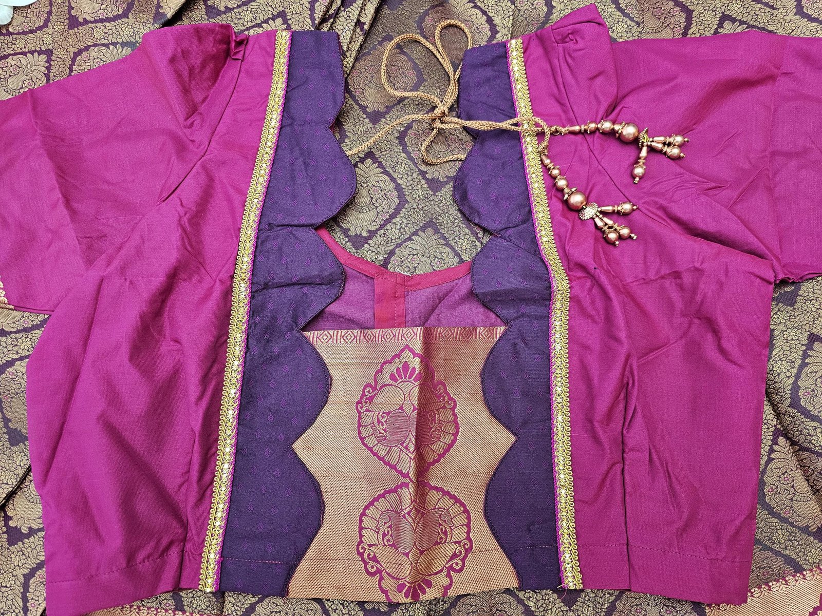 BLOUSE : BEAUTIFUL STITCHED DESIGNER BORDER BLOUSE WITH DANGLINGS.