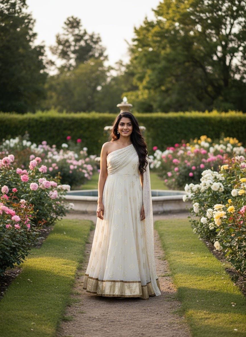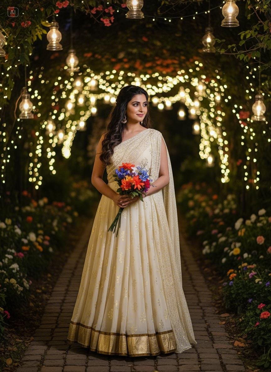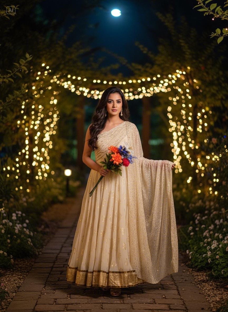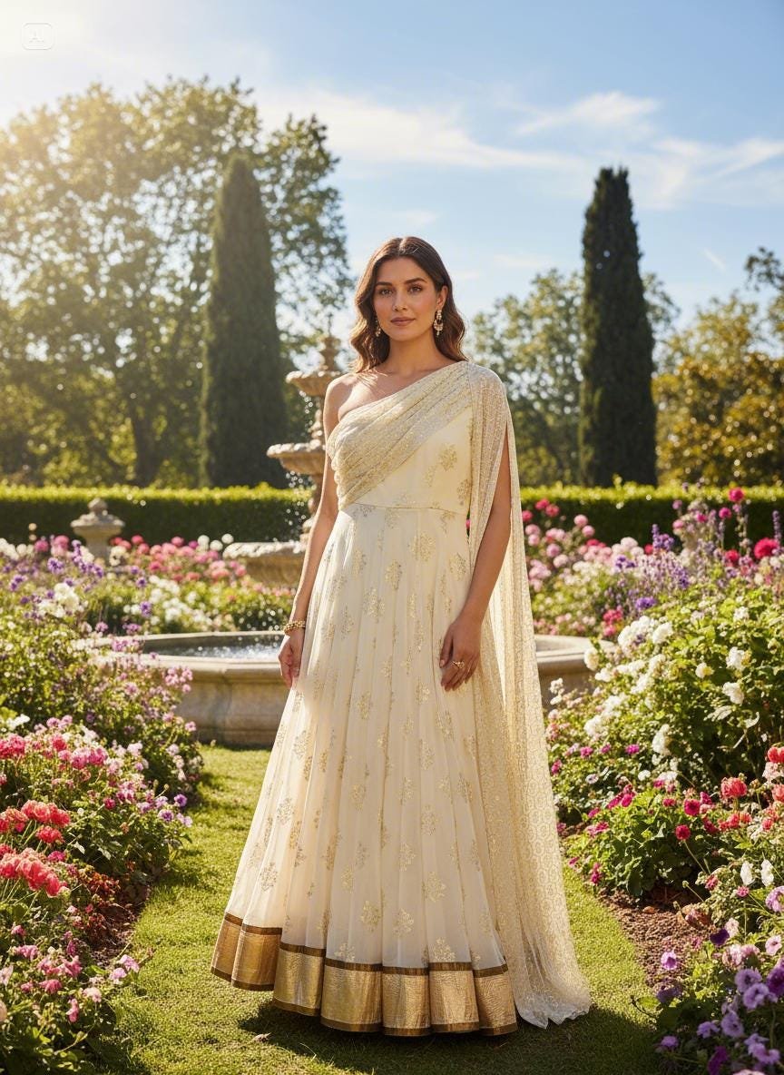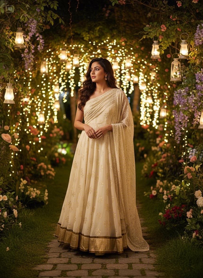 Elevate your festive wardrobe with this stunning cream Anarkali gown featuring delicate gold foil embroidery and a beautifully coordinated dupatta. Designed to bring elegance and grace to any celebration, this outfit is perfect for weddings, parties, Eid, Diwali, sangeet events, and special occasions.