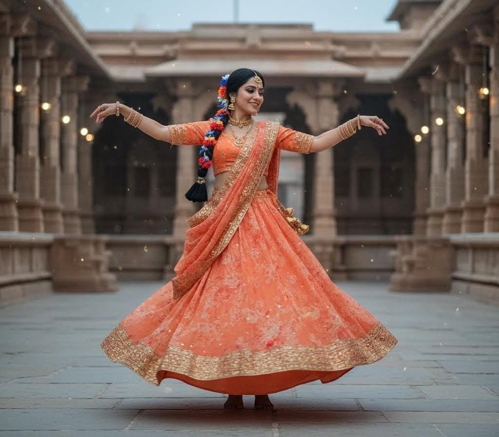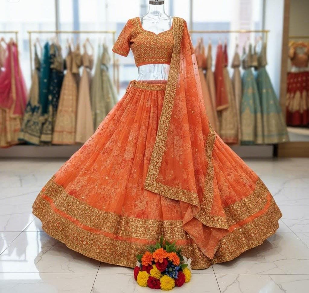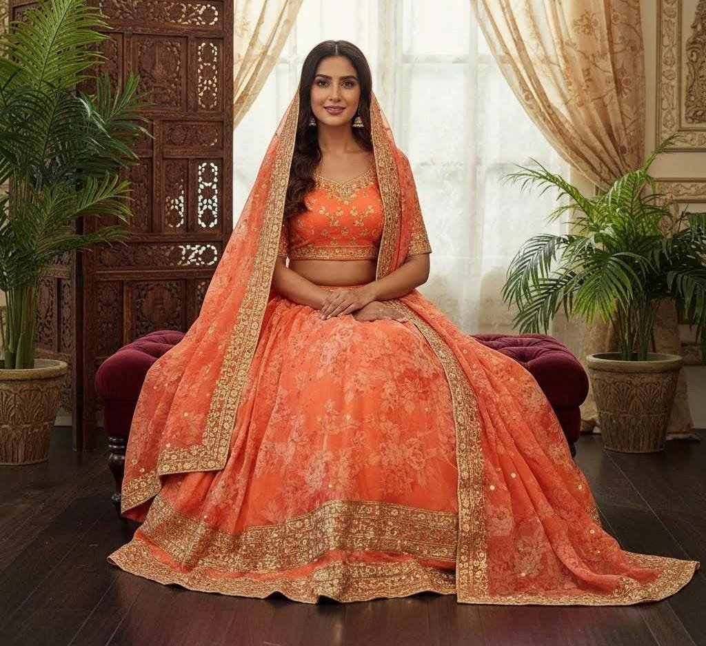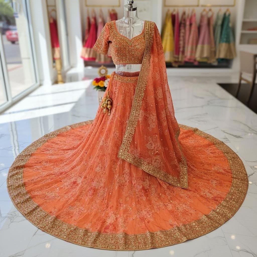 Step into elegance with this stunning Orange Floral Embroidered Lehenga Set, crafted with intricate golden thread work and delicate mirror accents. Designed for weddings, festivals, and special celebrations, this lehenga brings together traditional charm and modern silhouette.