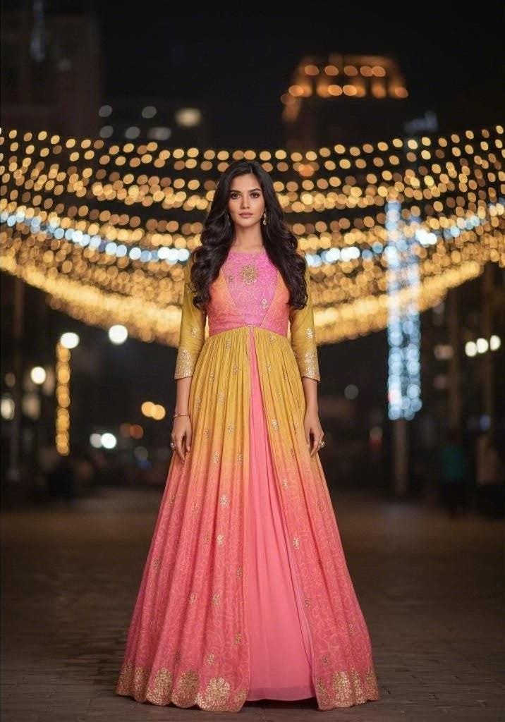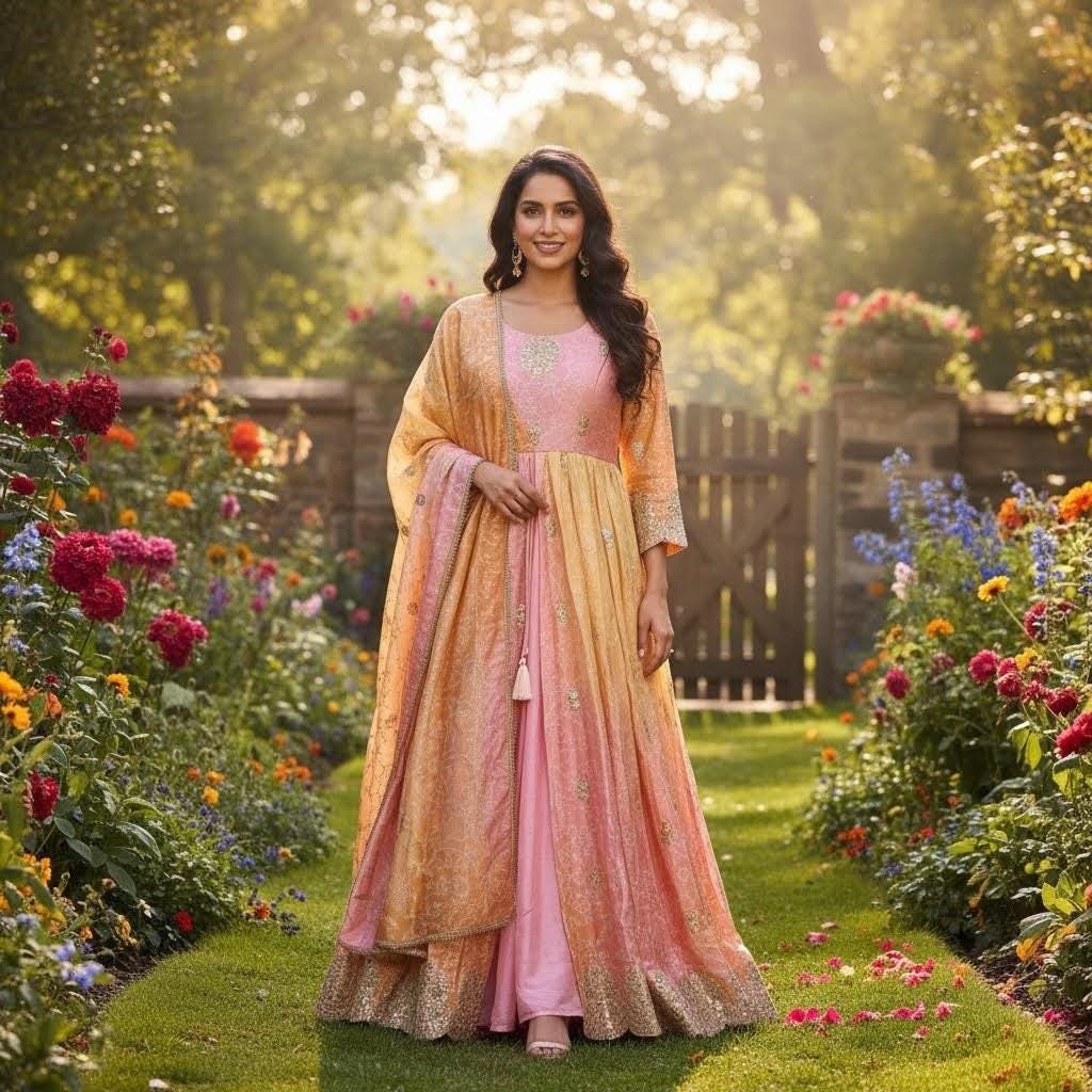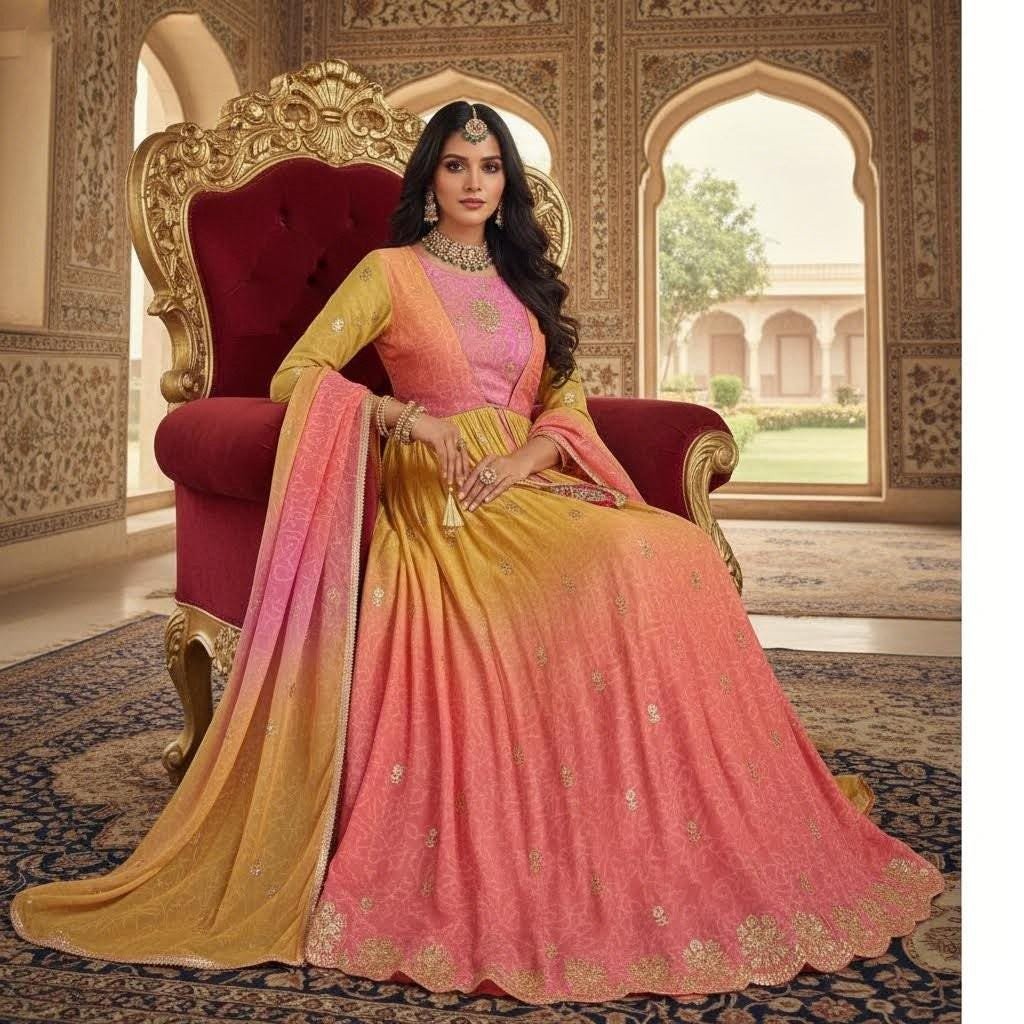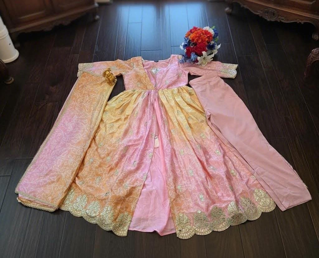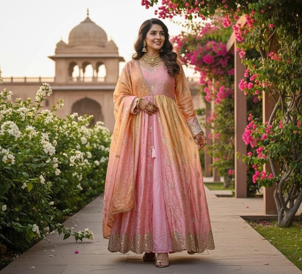 This elegant Pink & Peach Ombre Anarkali Suit is crafted with stunning golden embroidery and a unique gradient color pattern. The soft pastel tones paired with intricate detailing make this outfit perfect for weddings, festivals, and special occasions.