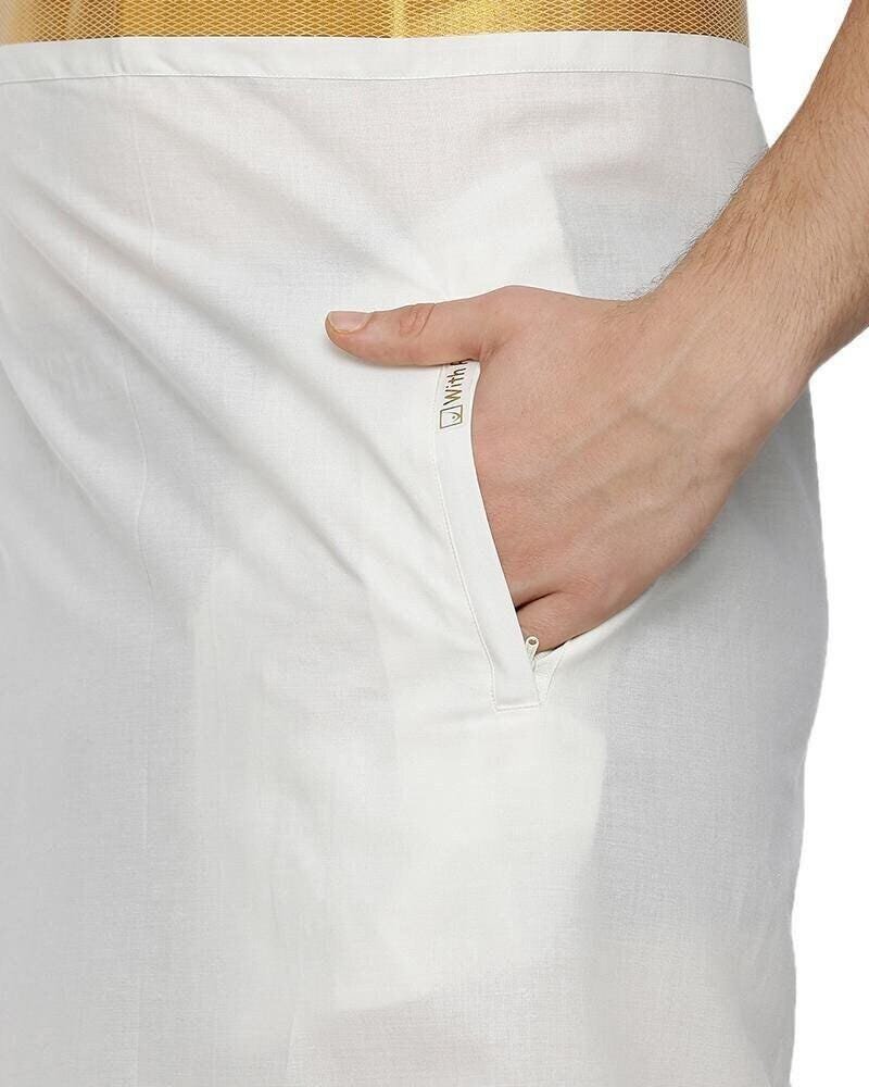 This dhoti is cream in color and not pure white. Product color may vary slightly due to lighting or screen/monitor settings.