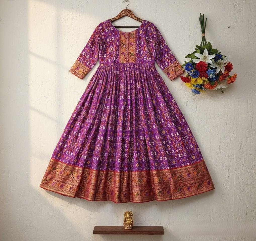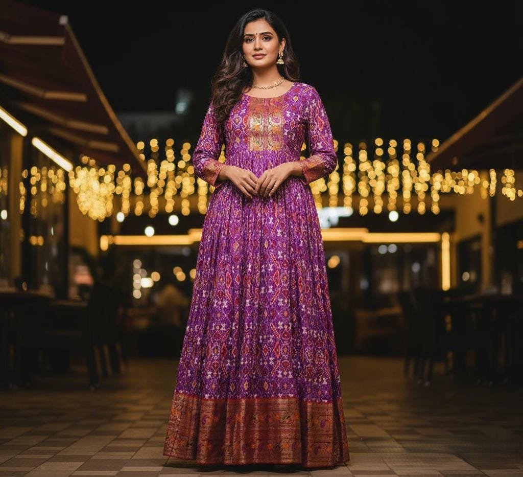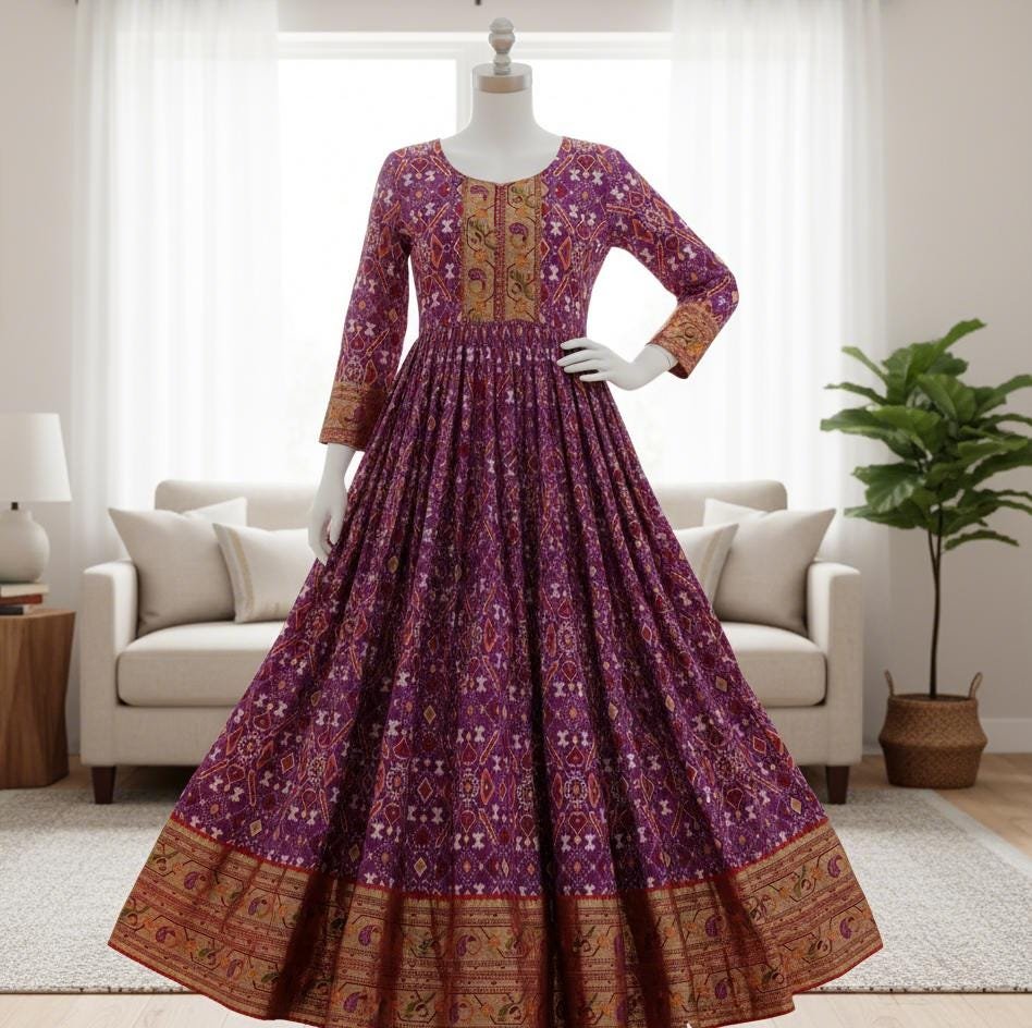 Vibrant Purple Ikkat Anarkali Dress | Handcrafted Ethnic Gown with Golden Border | Traditional Indian Festive & Wedding Wear
