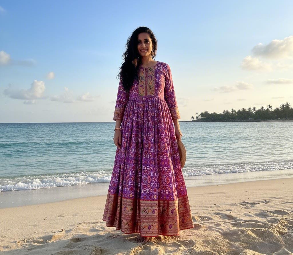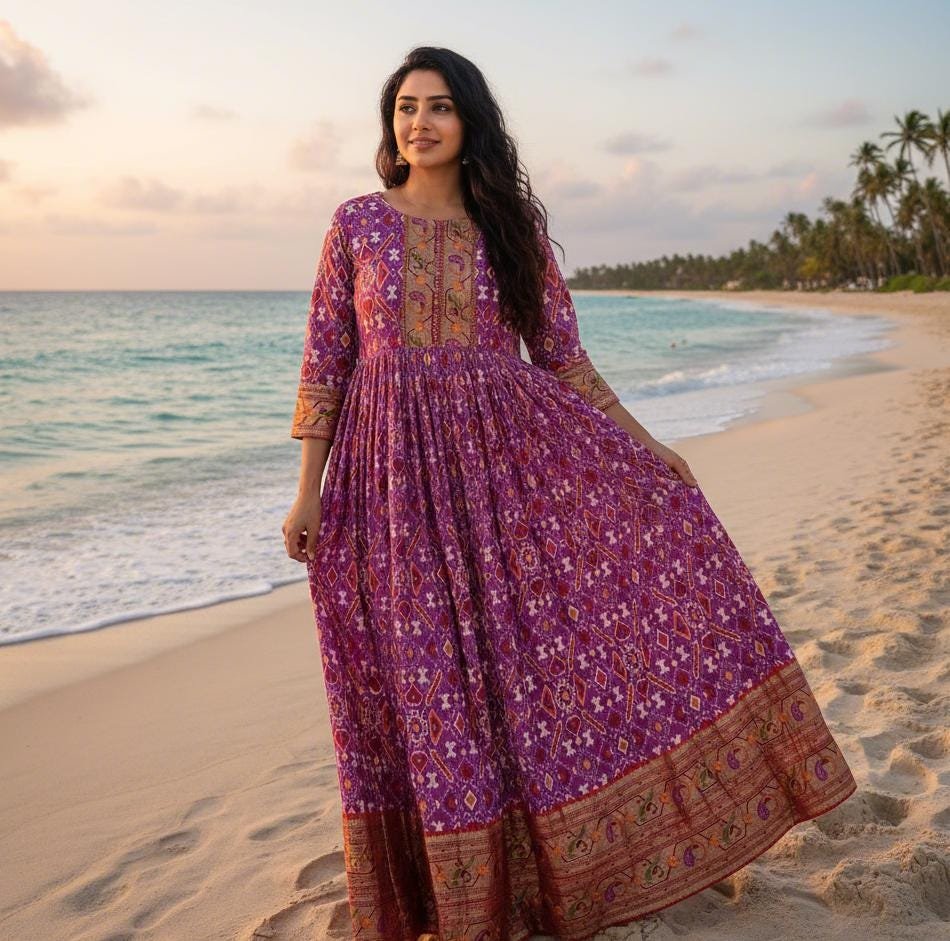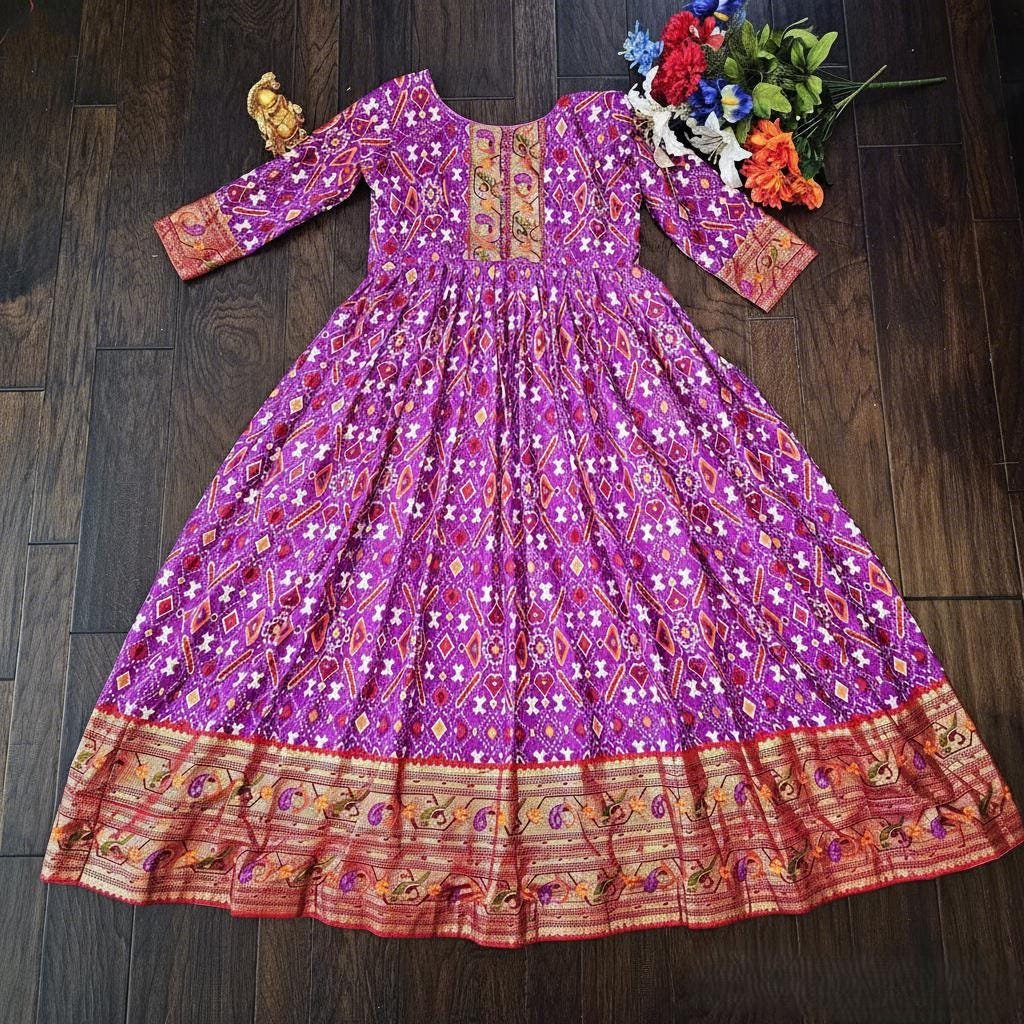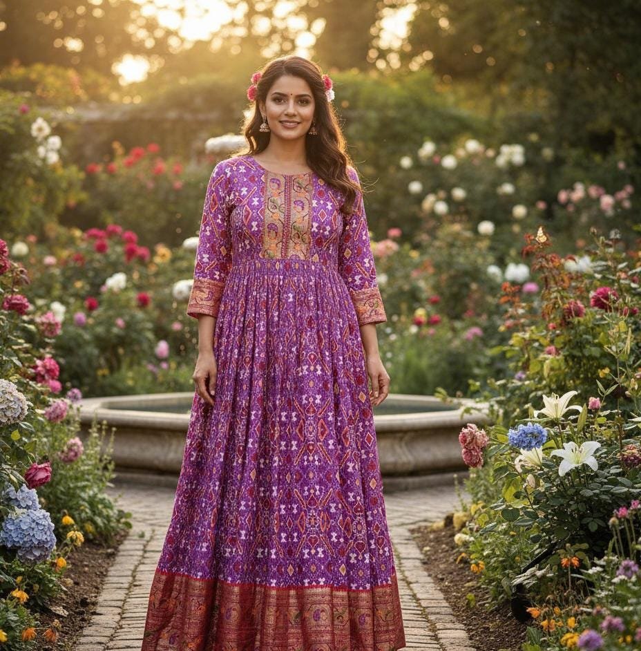 Vibrant Purple Ikkat Anarkali Dress | Handcrafted Ethnic Gown with Golden Border | Traditional Indian Festive & Wedding Wear
