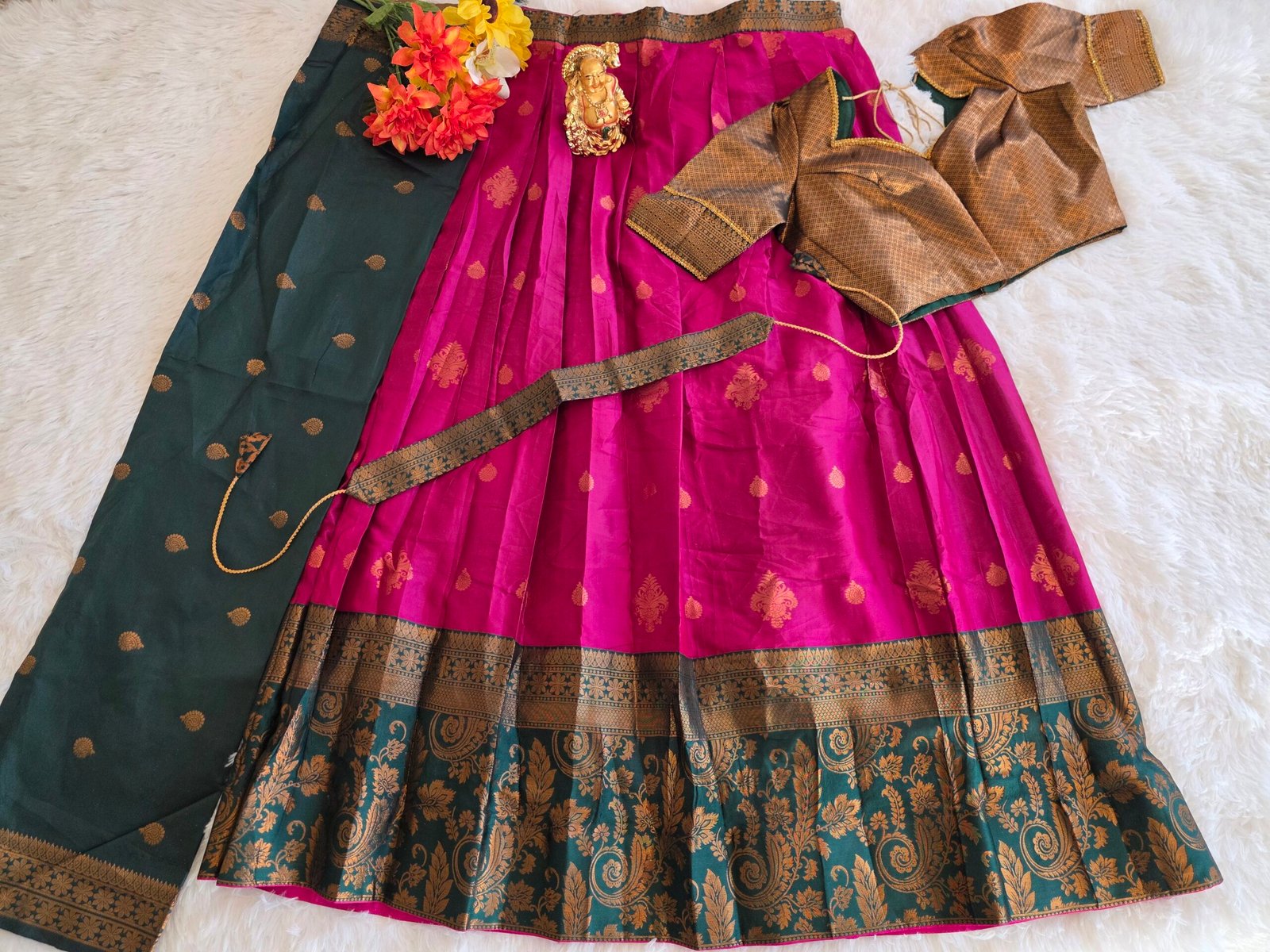 ready to wear trendy semi silk half sarees sets 4 piece fully stitched setReady To Wear 4 Piece Trendy Semi Silk Half Sarees Set – Pink and Green