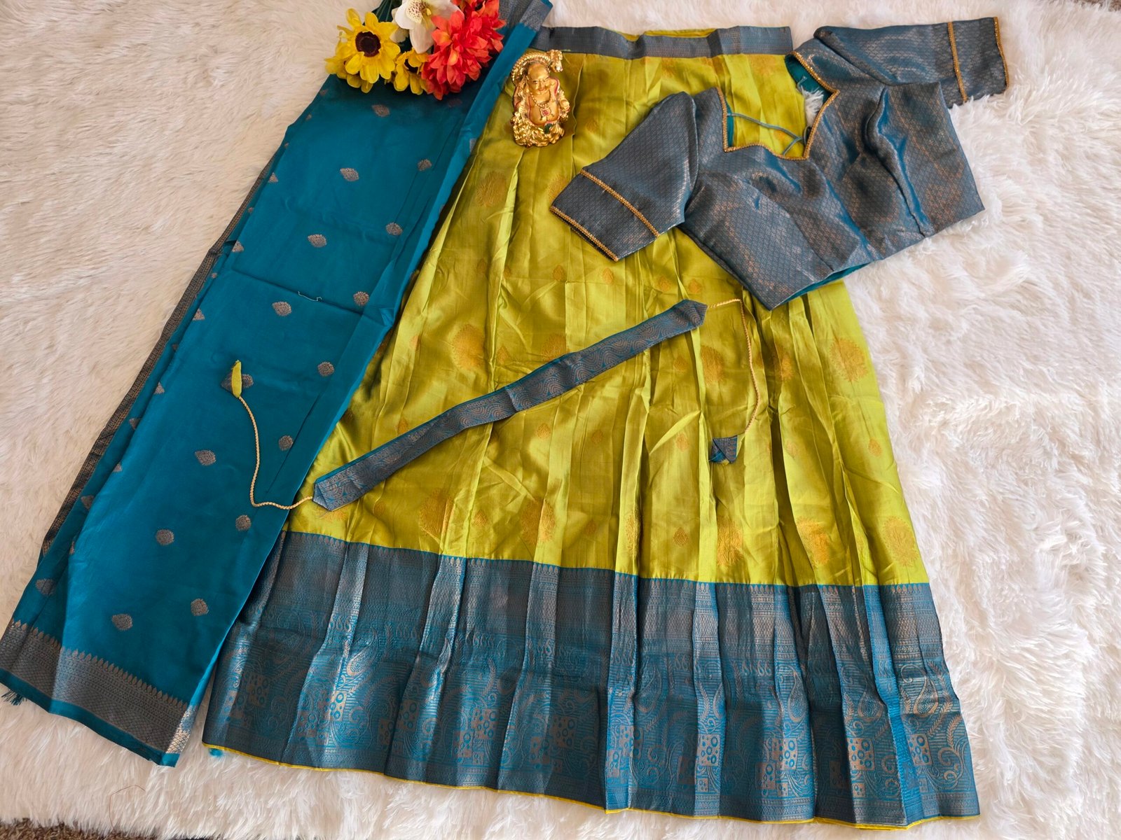 Ready To Wear 4 Piece Trendy Semi Silk Half Sarees Set – Green Teal Mango