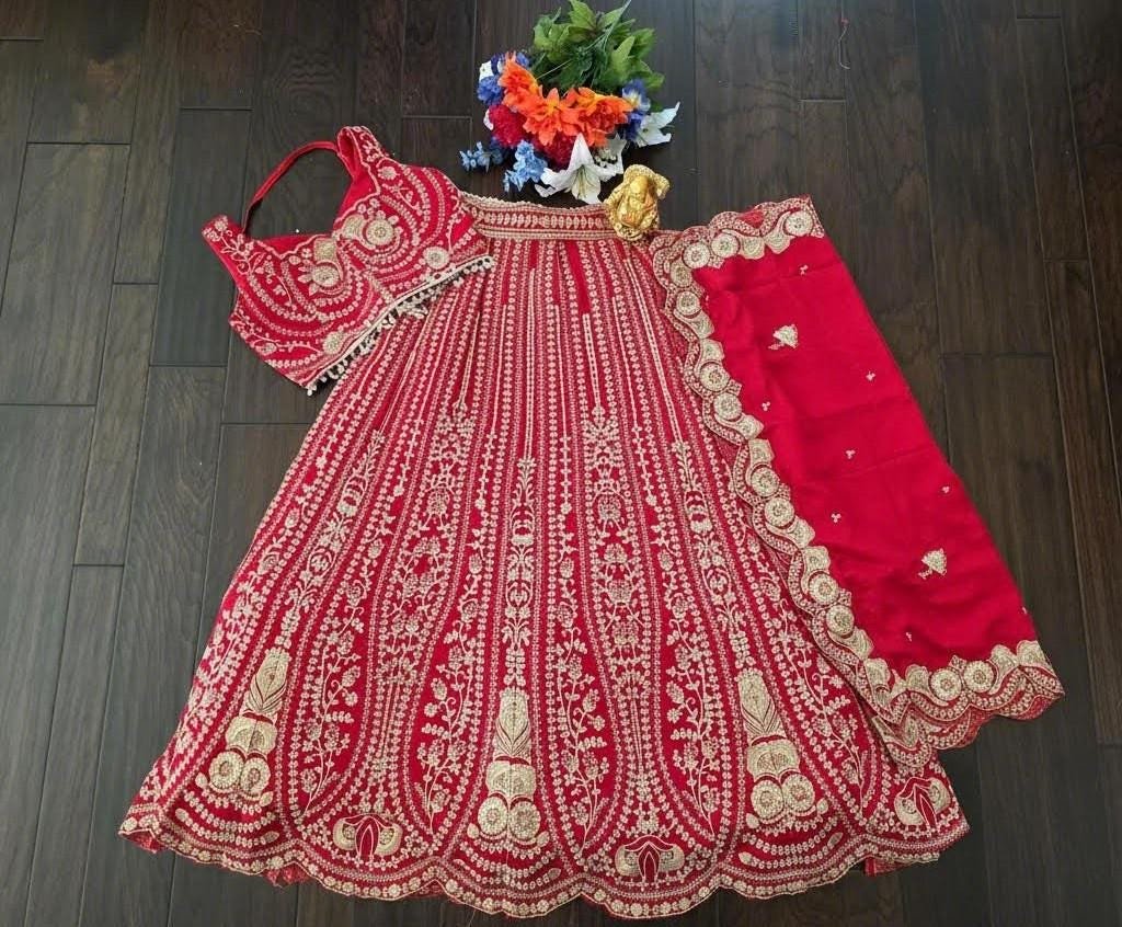 Red Bridal Embroidered Lehenga Set • Heavy Wedding Lehenga Choli with Dupatta • Red Gold Zari Work Indian Bridal Outfit • Festive Partywear Ghagra Choli
