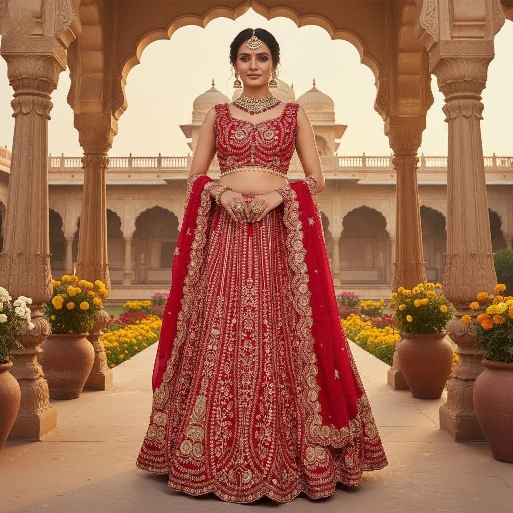 Make a grand statement with this stunning red and gold heavy embroidered lehenga set, designed for weddings, receptions, and all premium Indian celebrations. Crafted with intricate zari, thread, and sequin embroidery, this lehenga radiates traditional charm with a rich modern finish.