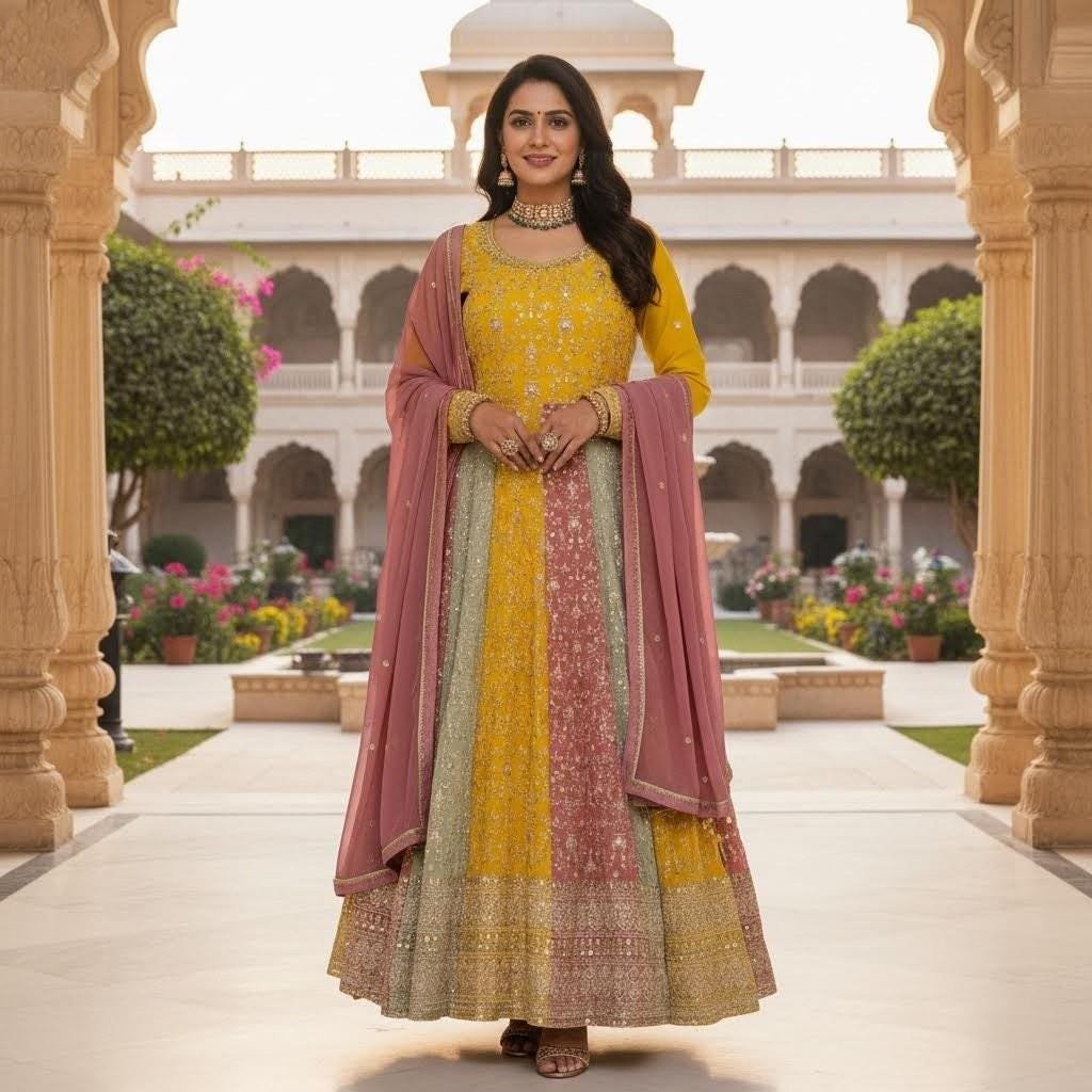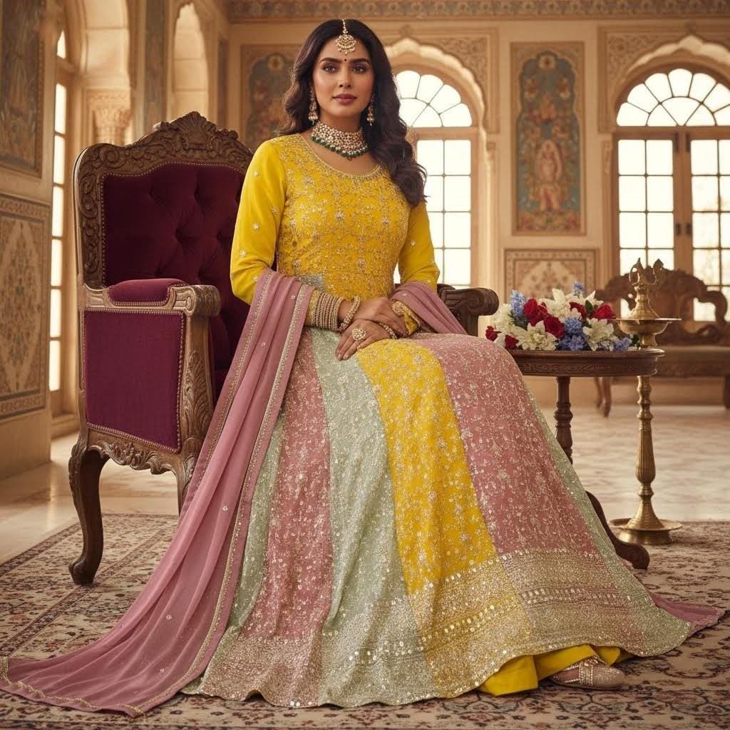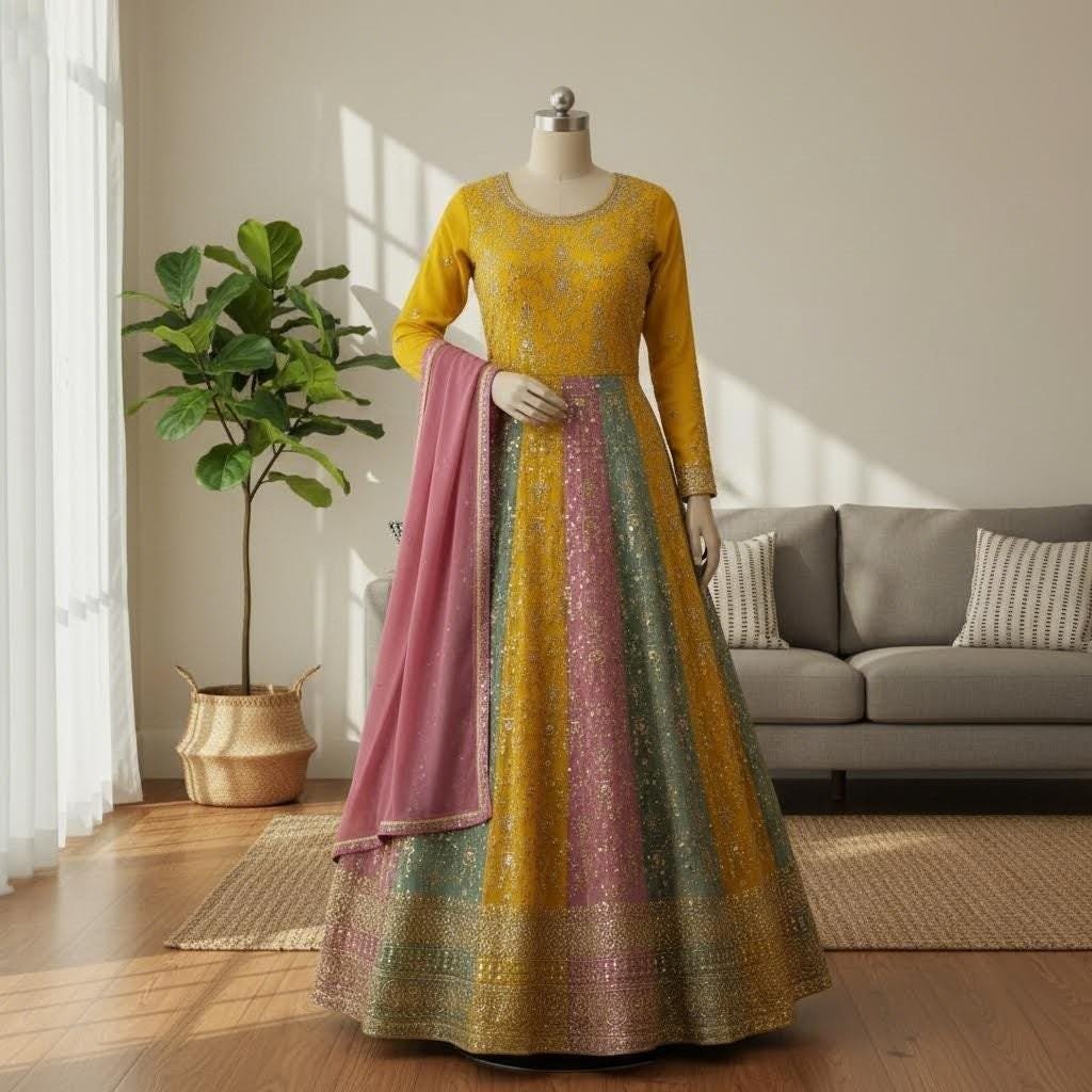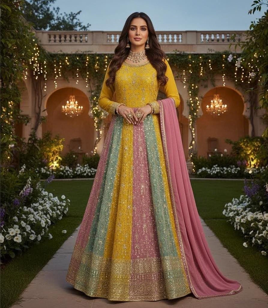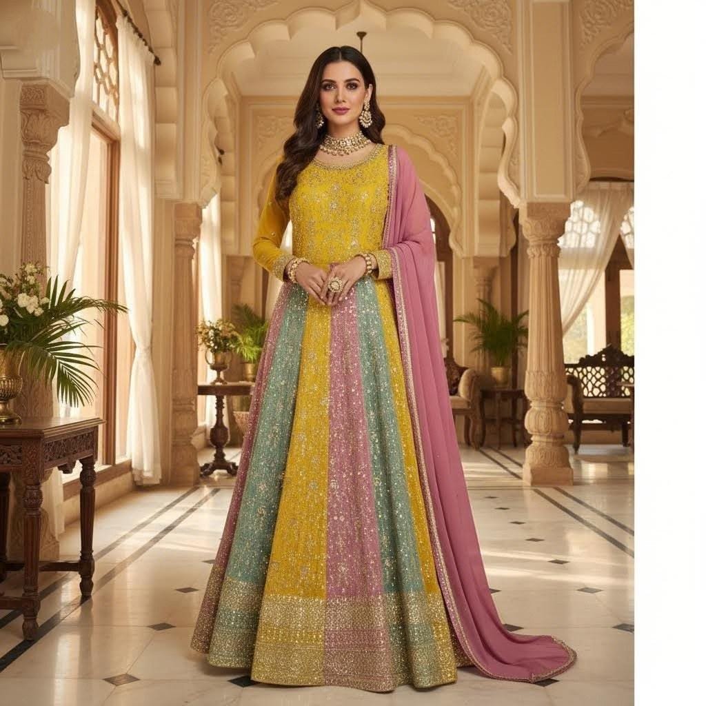 Bright, elegant, and beautifully detailed — this stunning yellow multicolor Anarkali suit is perfect for festivals, weddings, parties, and family celebrations.