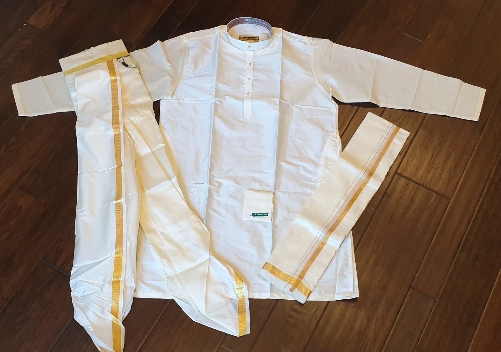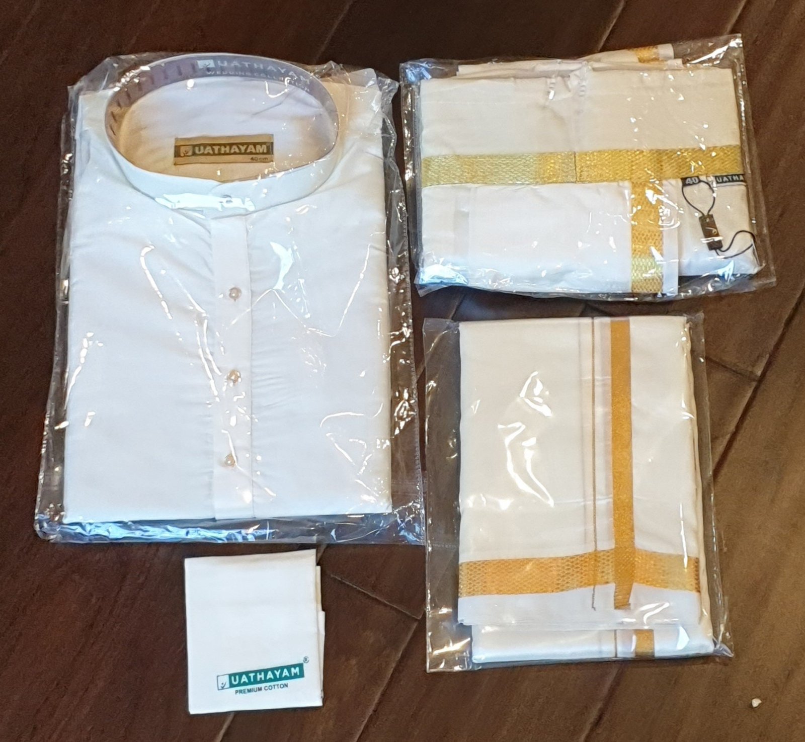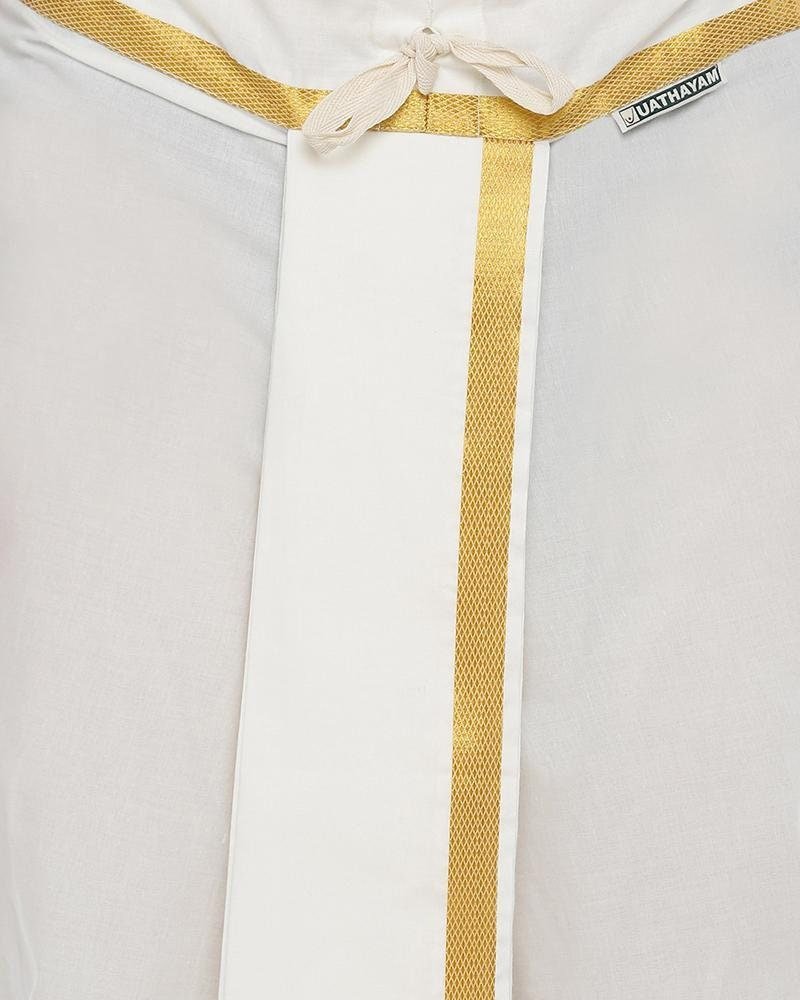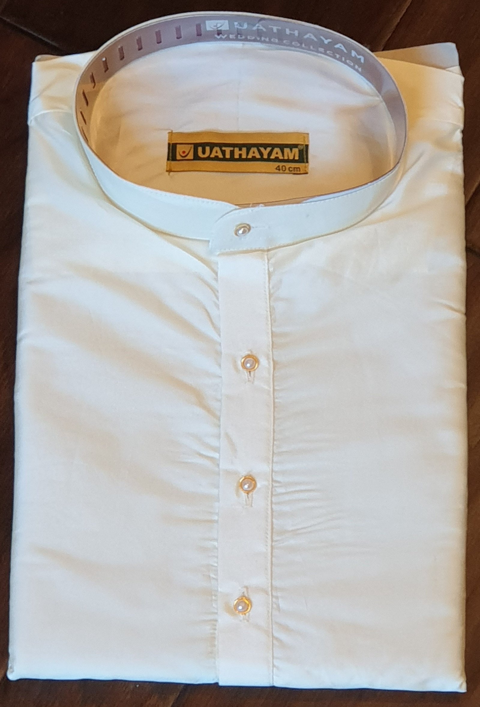 Size 40 cm – Subhamangalam/Wedding Kurta Panchakacham Collection 4 in 1 Cream Set For Men 40 cm – Full Kurta, Panchakacham, Jari Towel, Hand Kerchief for the ultimate wedding occasion.