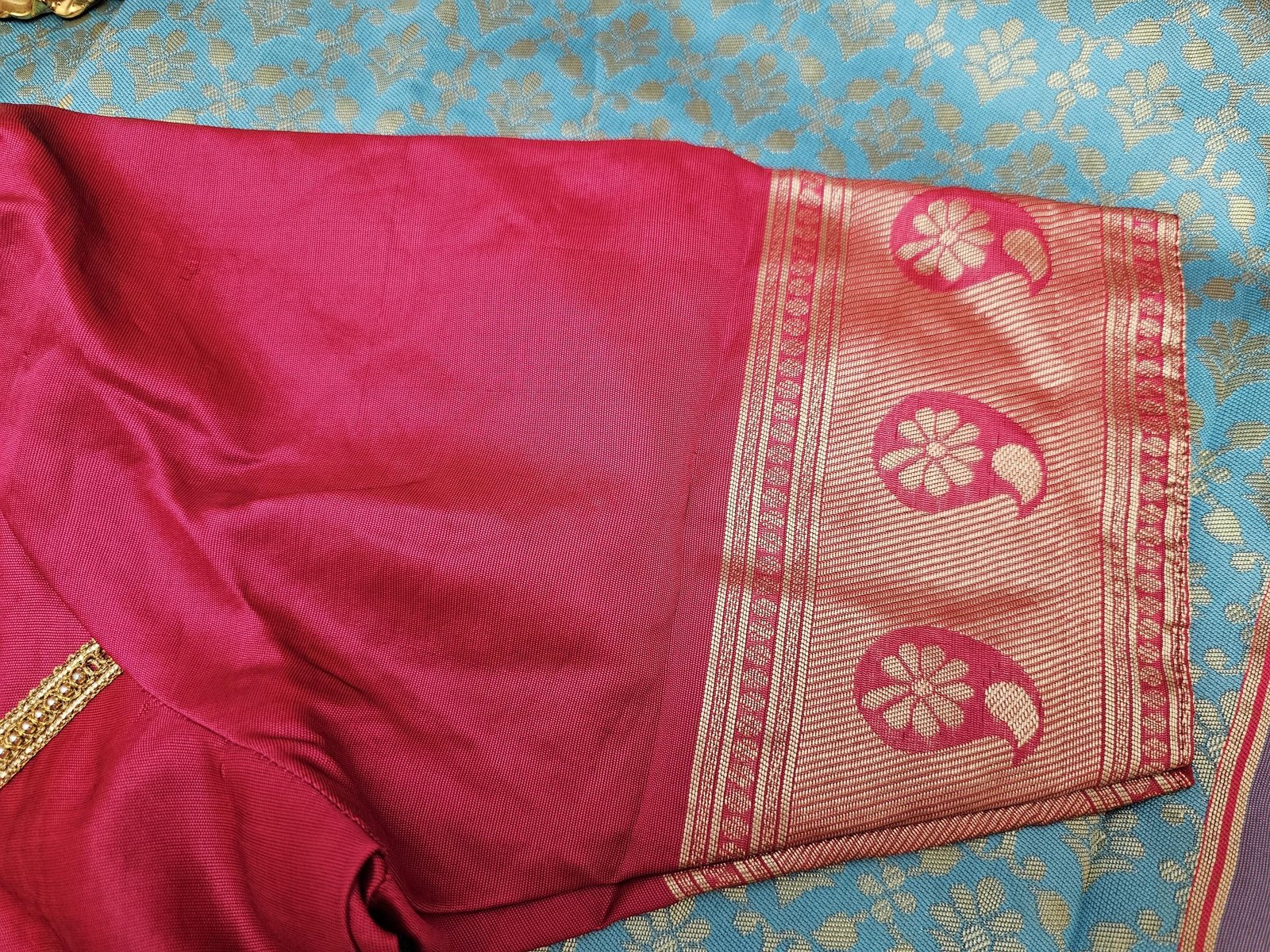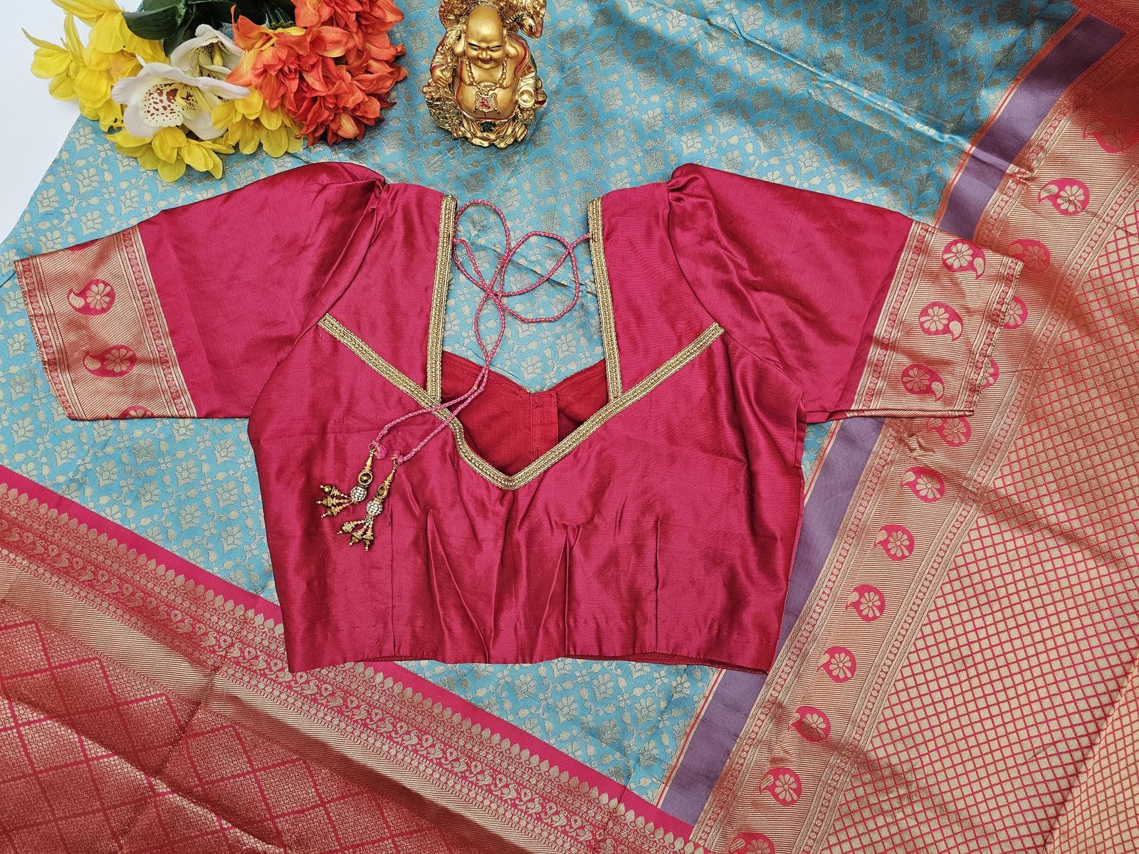 BLOUSE : BEAUTIFUL STITCHED DESIGNER BORDER BLOUSE WITH DANGLINGS.