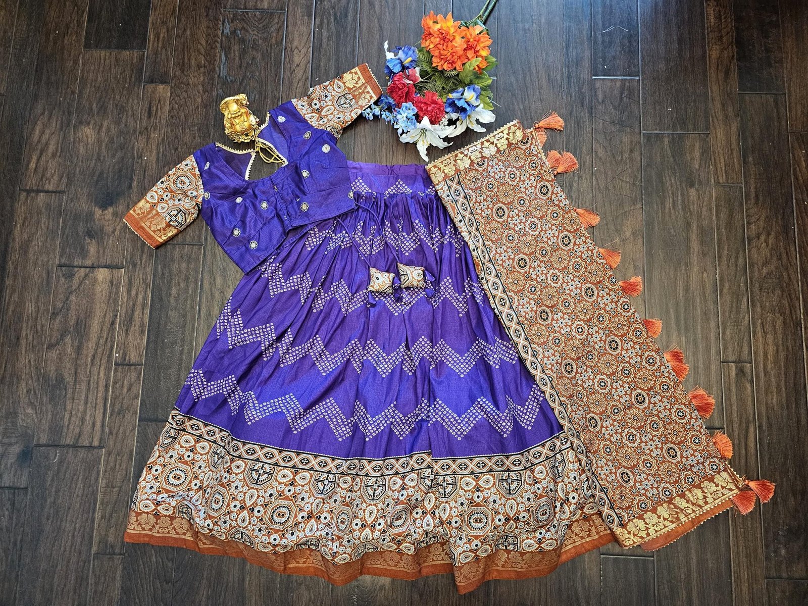 Make a vibrant, unforgettable statement in this beautiful VioletLehenga Choli Set. This outfit is a celebration of traditional Indian design, featuring a stunning contrast with its rust-orange dupatta. It’s the perfect attire for Navratri, Garba/Dandiya events, Diwali, or any festive celebration where you want a rich, energetic look.