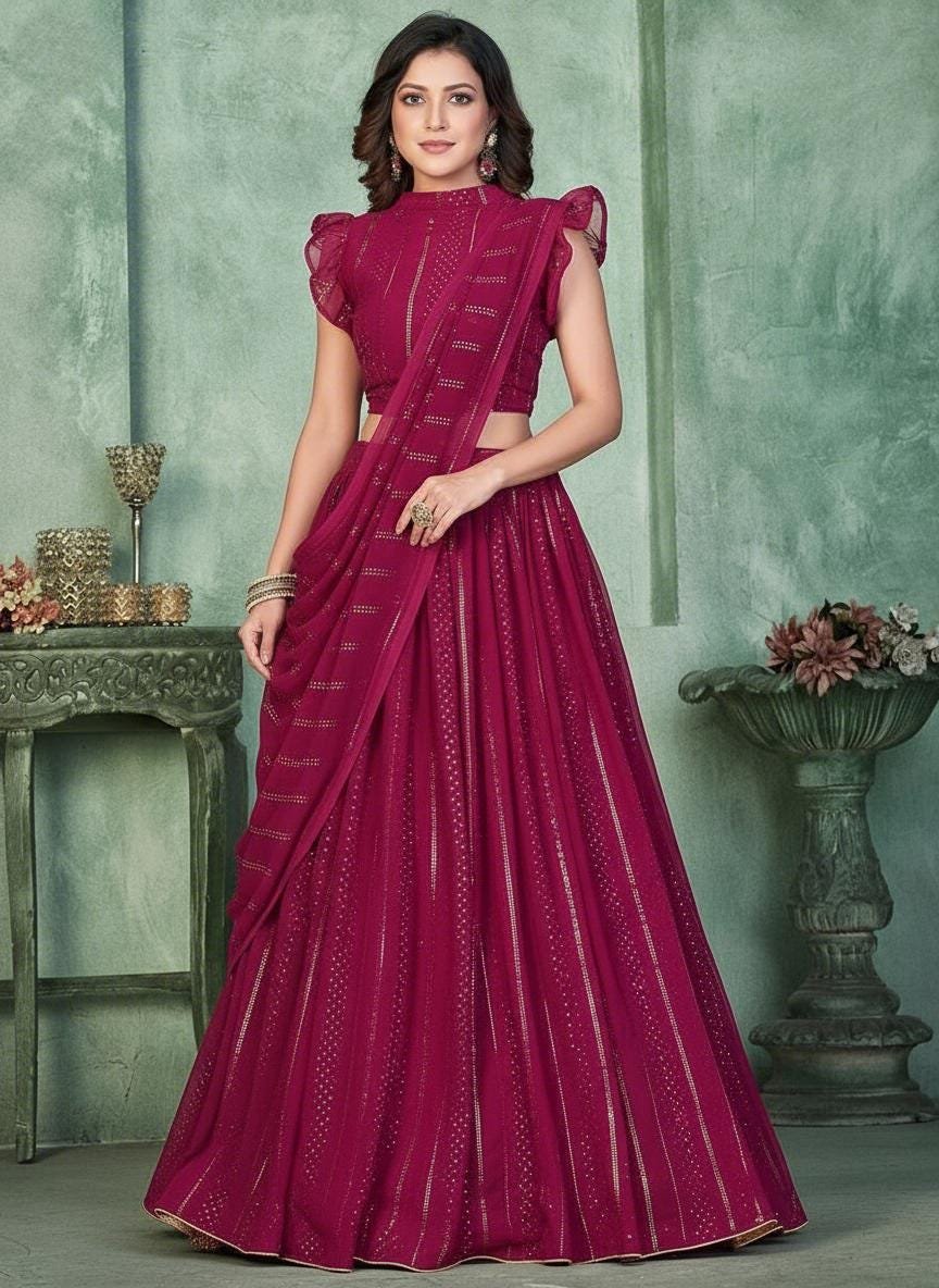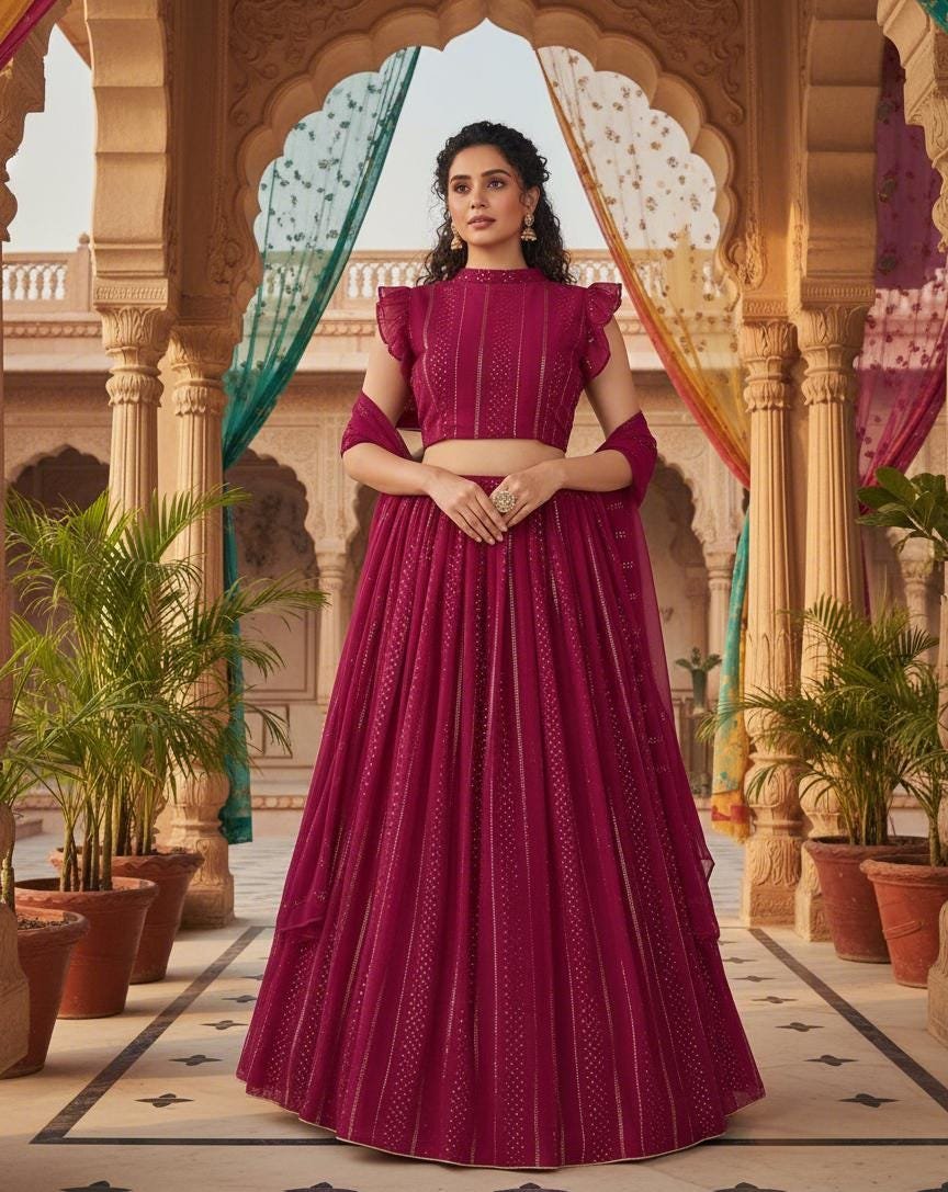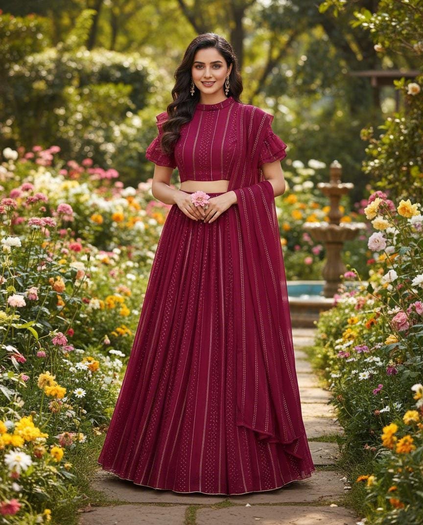 This stunning wine color designer lehenga choli is crafted in soft georgette with delicate sequin lines, giving it a luxurious, modern Bollywood-style look. The unique ruffle-sleeve blouse, paired with the flowing embroidered lehenga and matching dupatta, creates a sophisticated silhouette ideal for weddings, receptions, sangeet nights, engagement parties, festive events, and photoshoots.