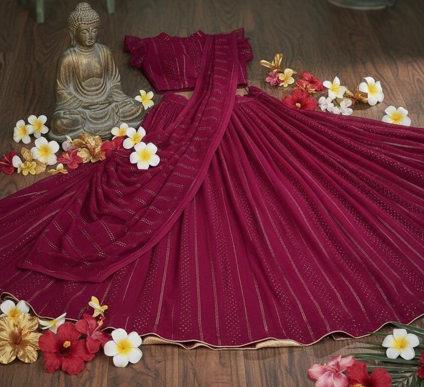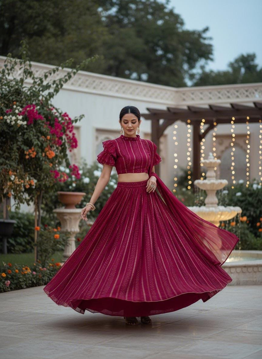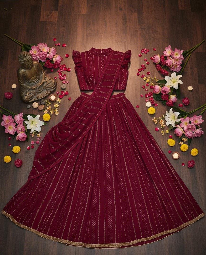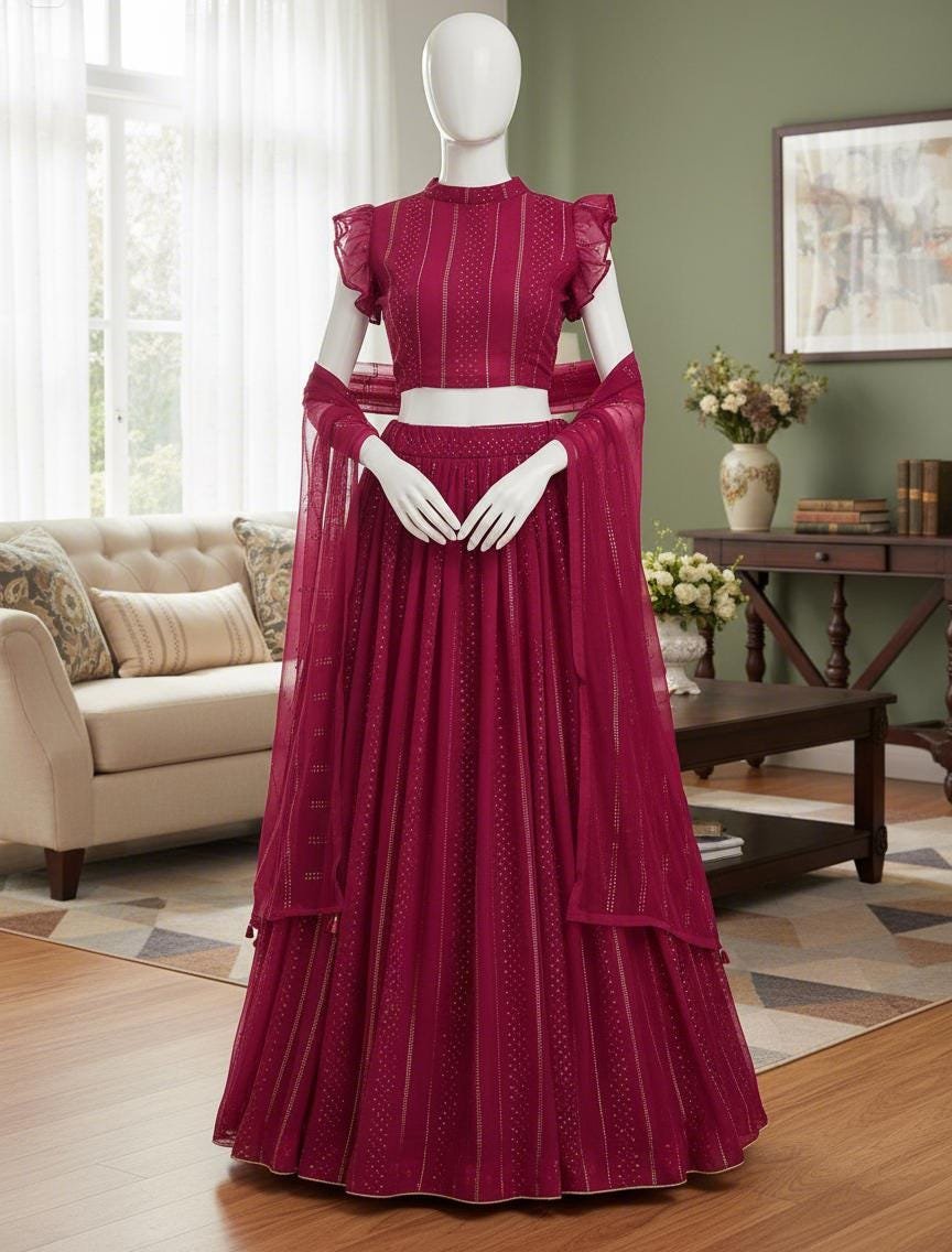 This stunning wine color designer lehenga choli is crafted in soft georgette with delicate sequin lines, giving it a luxurious, modern Bollywood-style look. The unique ruffle-sleeve blouse, paired with the flowing embroidered lehenga and matching dupatta, creates a sophisticated silhouette ideal for weddings, receptions, sangeet nights, engagement parties, festive events, and photoshoots.