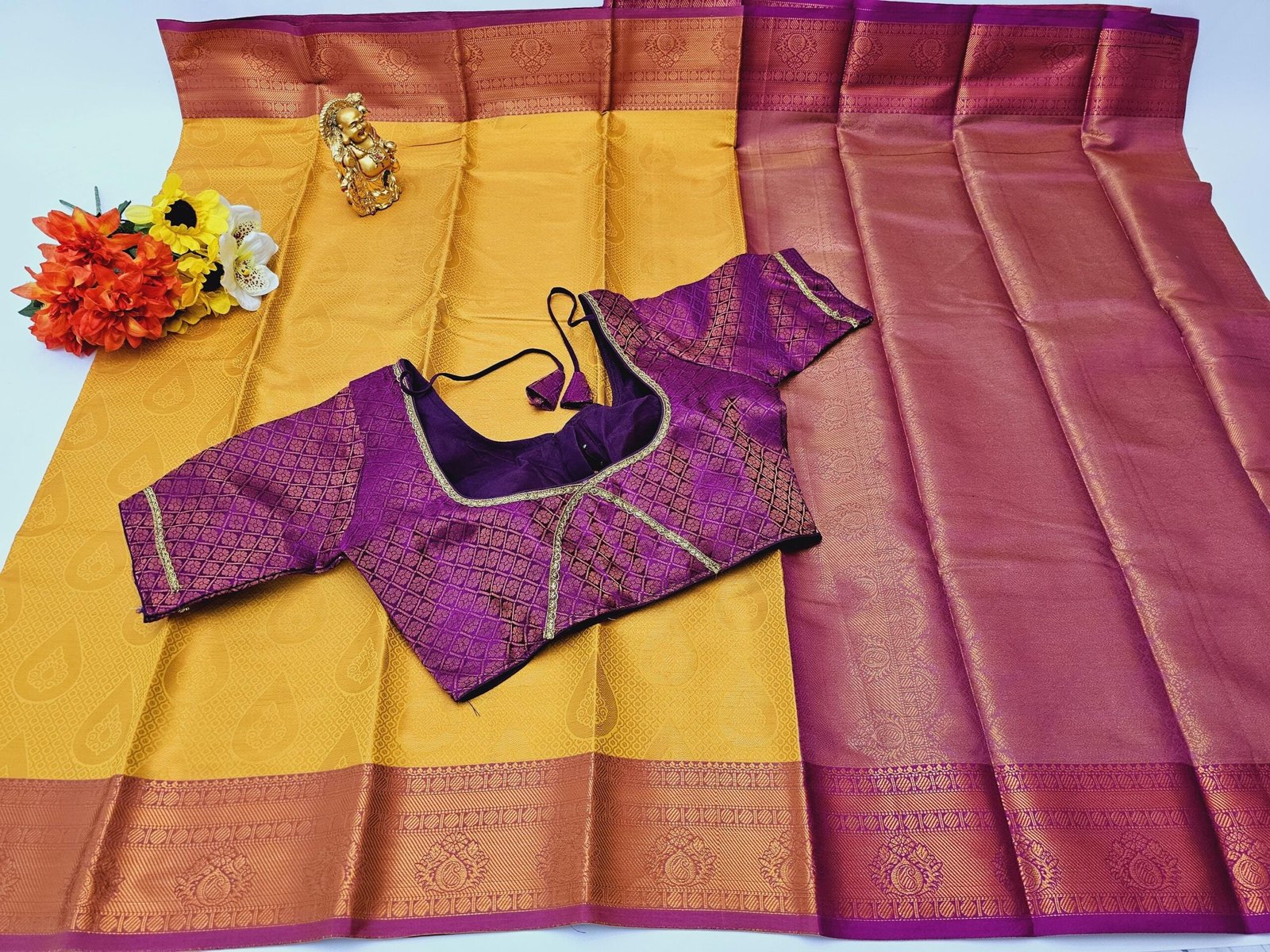 Elegant Silk Saree with intricate weaving work, accompanied by an unstitched running blouse and a FREE designer blouse, Perfect for Weddings/Parties.