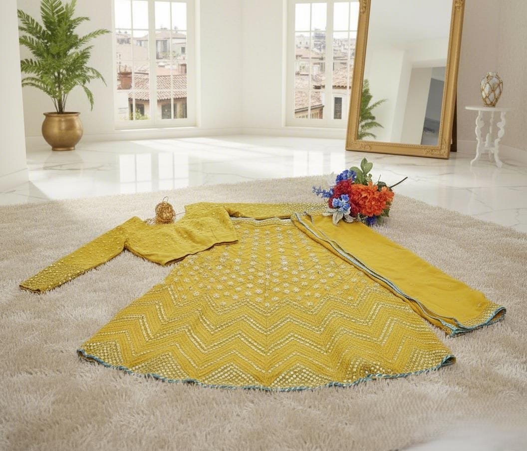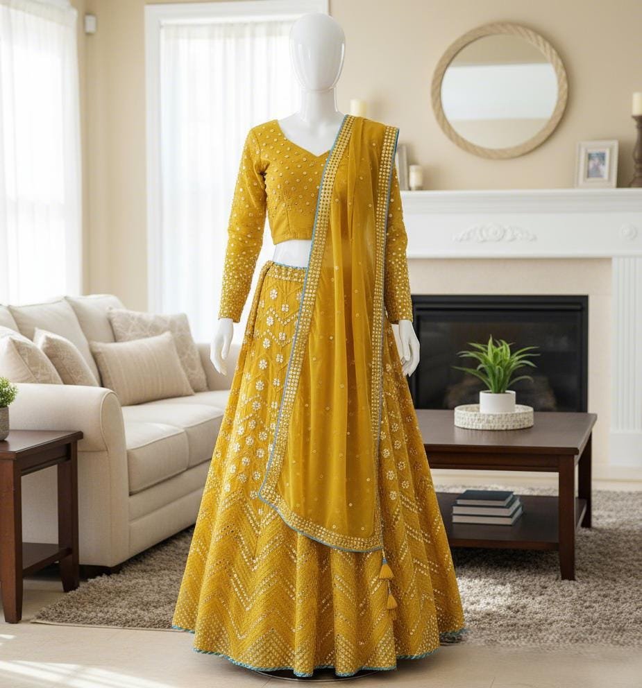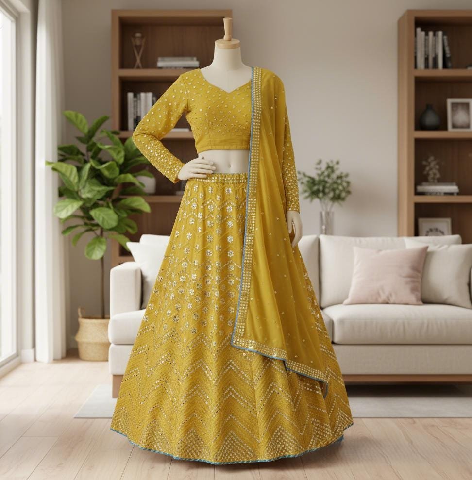 Illuminate any celebration with this gorgeous Yellow Mirror Work Lehenga Choli Set! This vibrant and heavily embellished outfit is designed to make you shine, perfect for Haldi ceremonies, Sangeet, Mehendi, Diwali, Navratri, or any festive occasion where you want to dazzle.